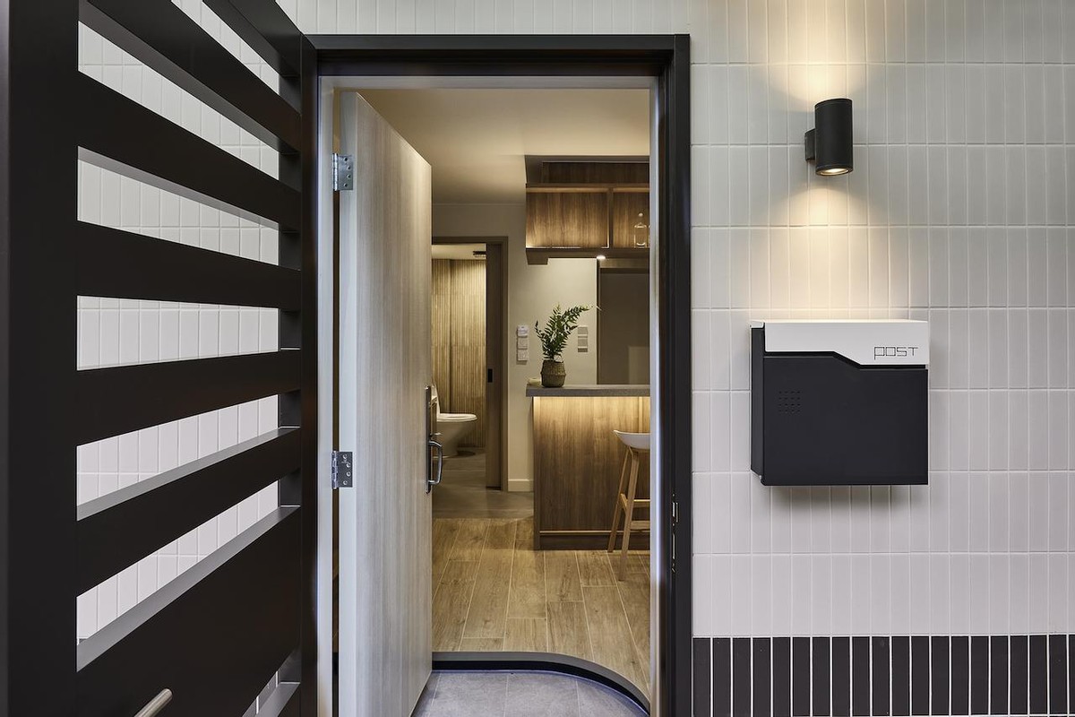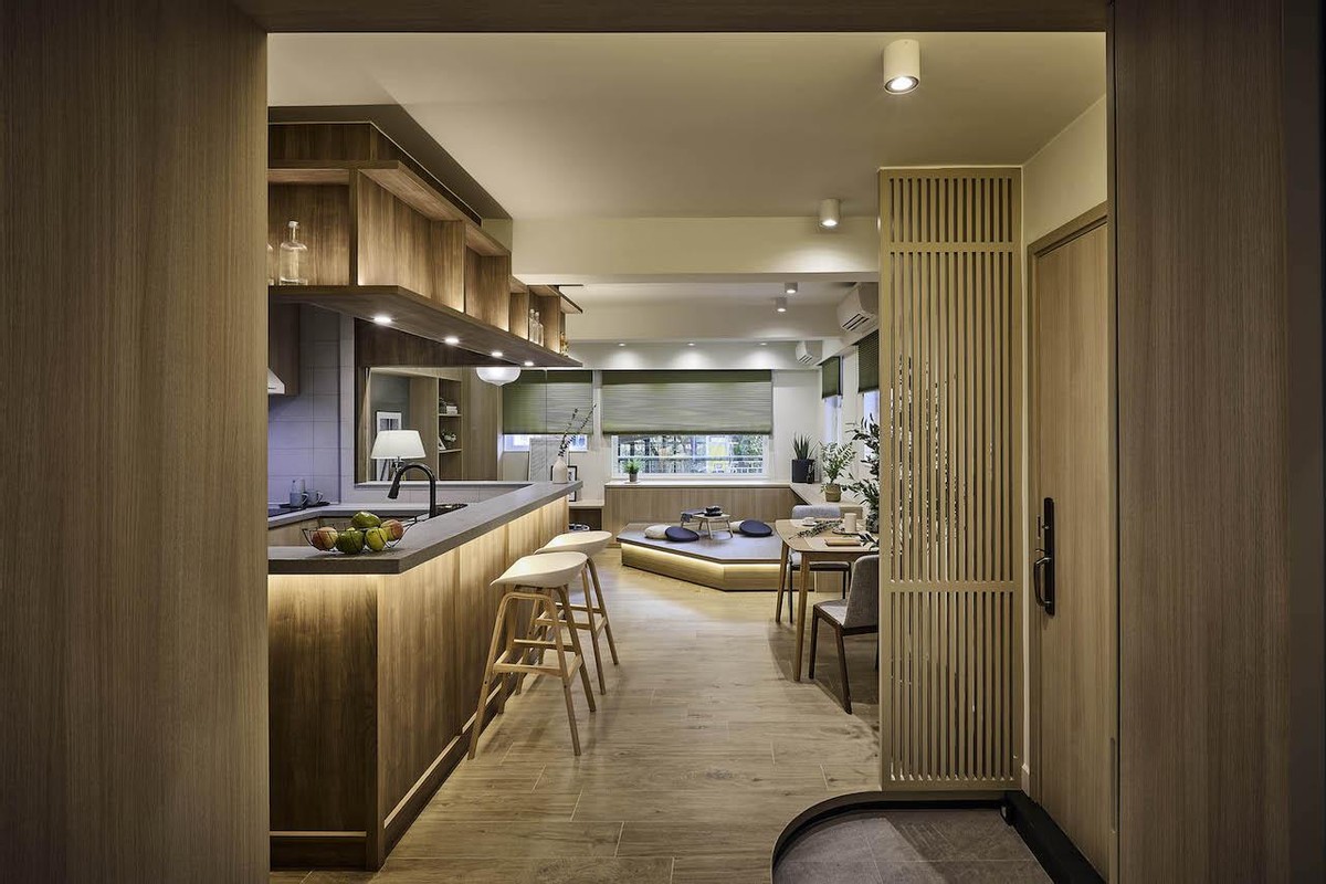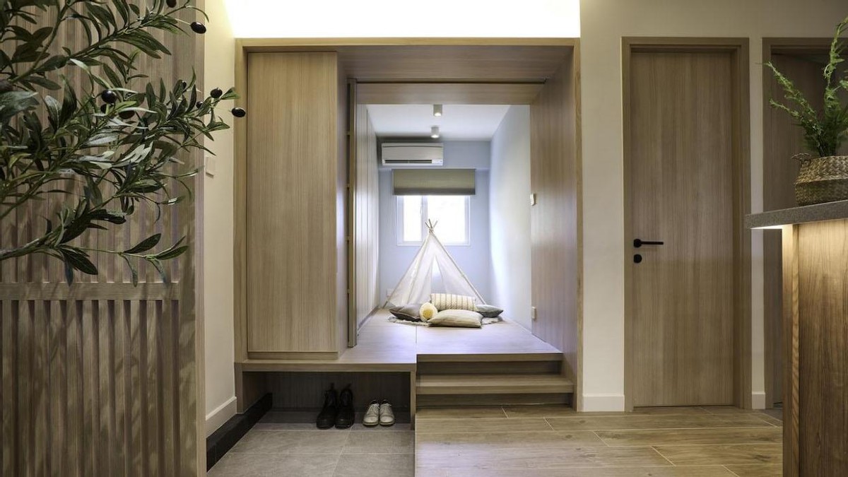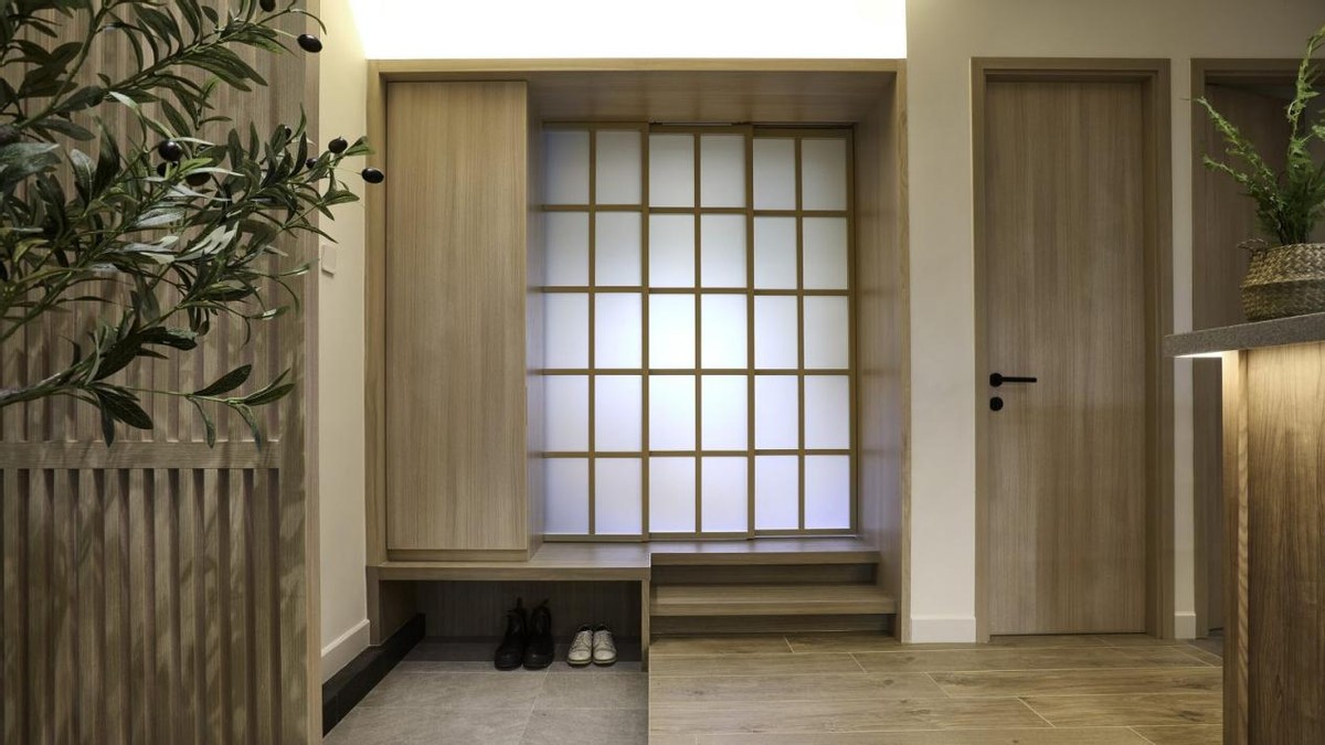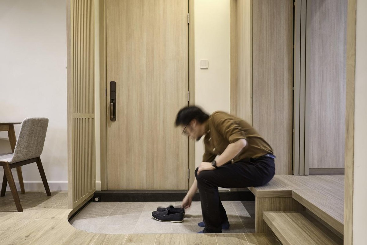 玄關門和廁所門對立而設,入戶處一部分地面是用瓷磚鋪設的,打掃衛生時方便許多。左側用條紋木格柵進行隔斷,右邊抬高的地面可用作換鞋凳,提供屋主較好的舒適體驗,下面留空部分能收納日常要換穿的鞋,拿取方便還不耽誤時間。