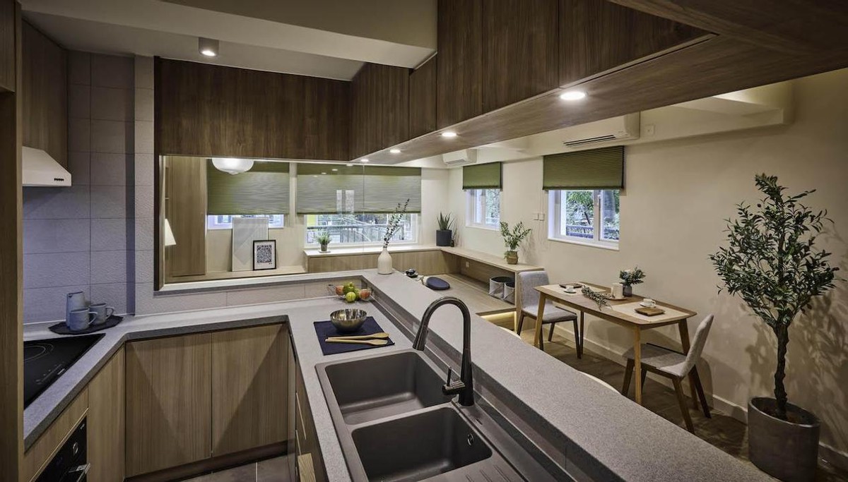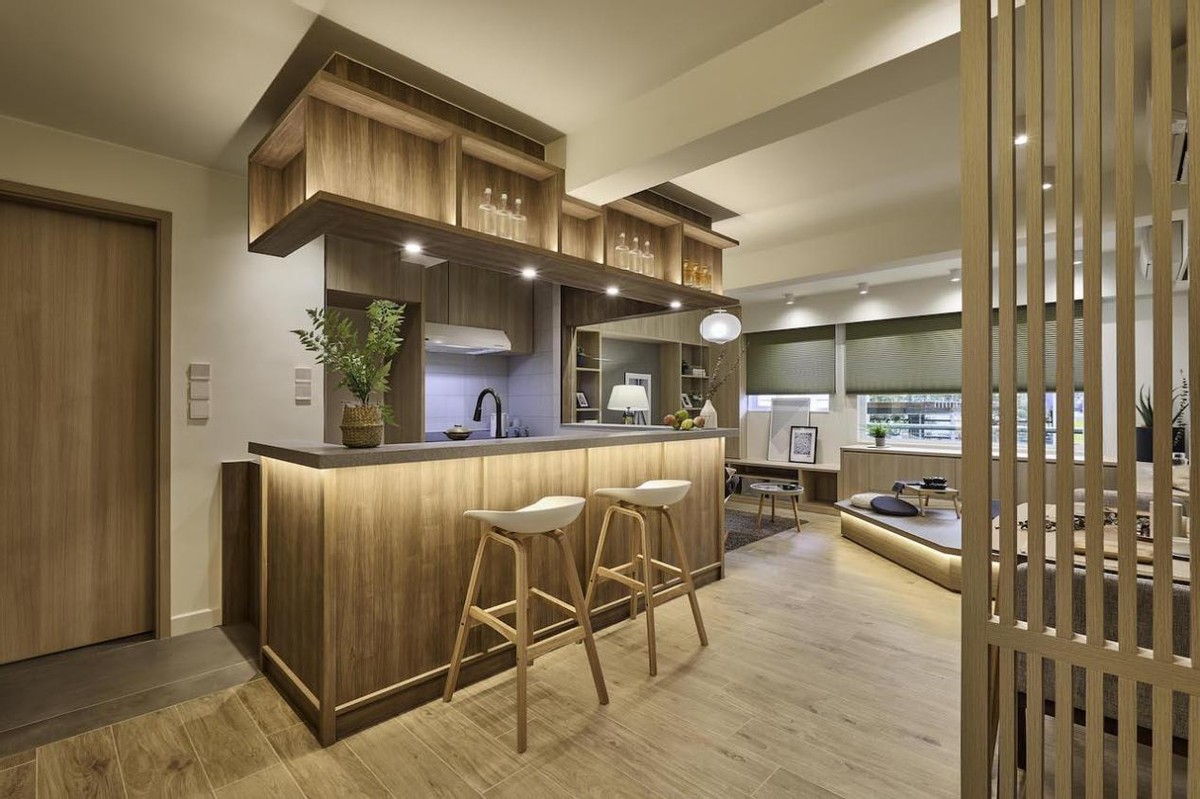 廚房為半開放式布局,在廁所門右側預留一個小門,也就是進入廚房的位置,台面升高部分用作吧台,和單人高腳凳的搭配,有種酒吧的即視感。整體主要採用地櫃和吊櫃相結合的方式,最有特色的地方是在吊櫃的外側又重新包了一圈,底面隔板內嵌燈帶,可用作展示或者收納櫃,放杯具和蠟燭都是沒什麼問題的。