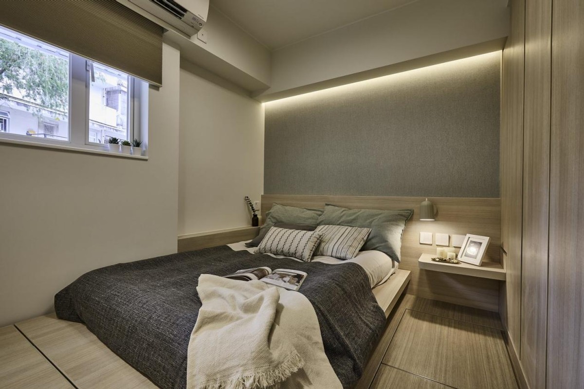 臥室的風格比較雅致,精巧的地台矮床顯得空間更加寬敞,床頭櫃為懸空設計,不占用地面空間,局部吊頂內嵌的燈帶烘托出清新溫暖的氛圍。