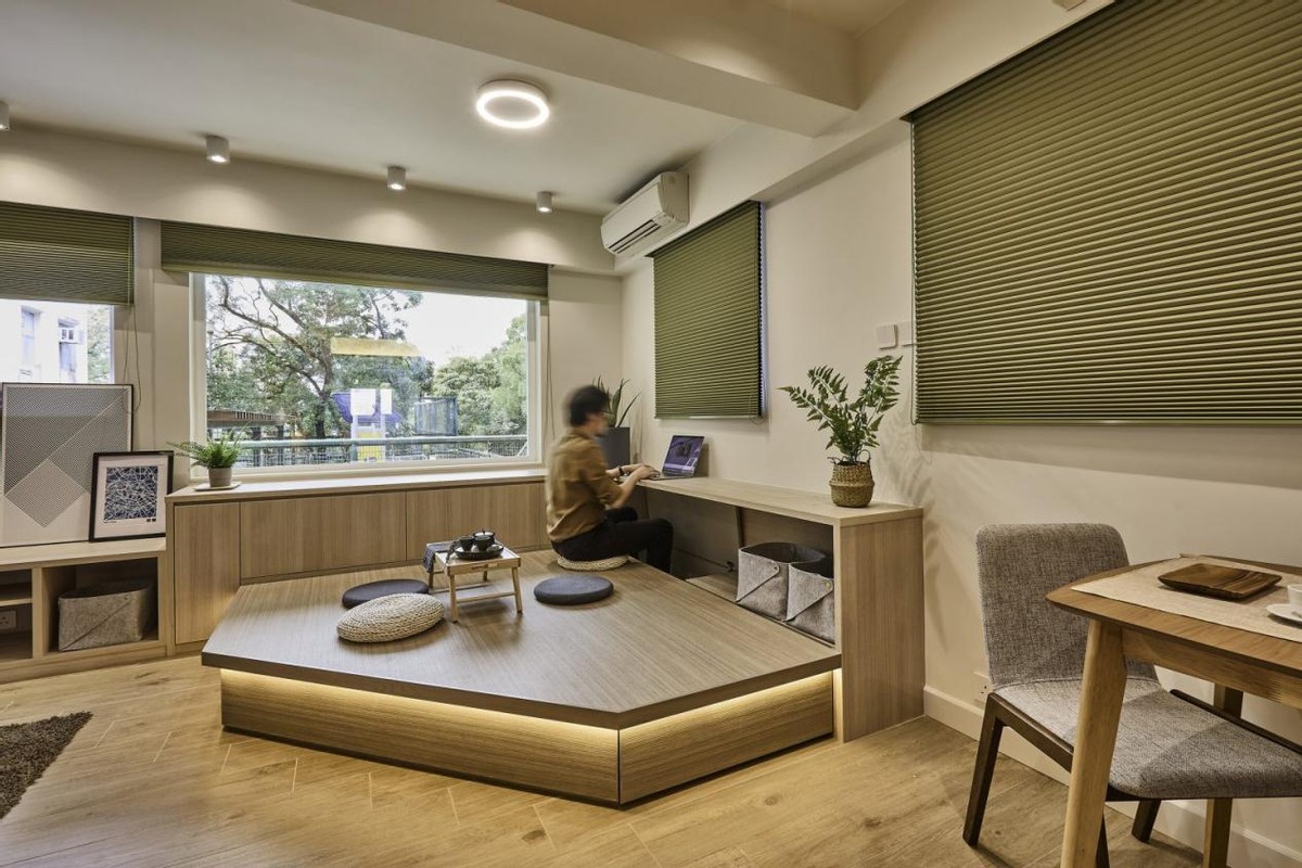 客廳是休閒區和辦公區的結合,右側地方可用作辦公室,平台放上茶幾和和編織凳,瞬間又成為了一個小茶室,格調和簡約並存。矮型儲物櫃依牆邊而設,布局成一個L型,封閉一側用來收納還不易落灰,另一側就可以當辦公桌啦,坐在台面上舒適放鬆。