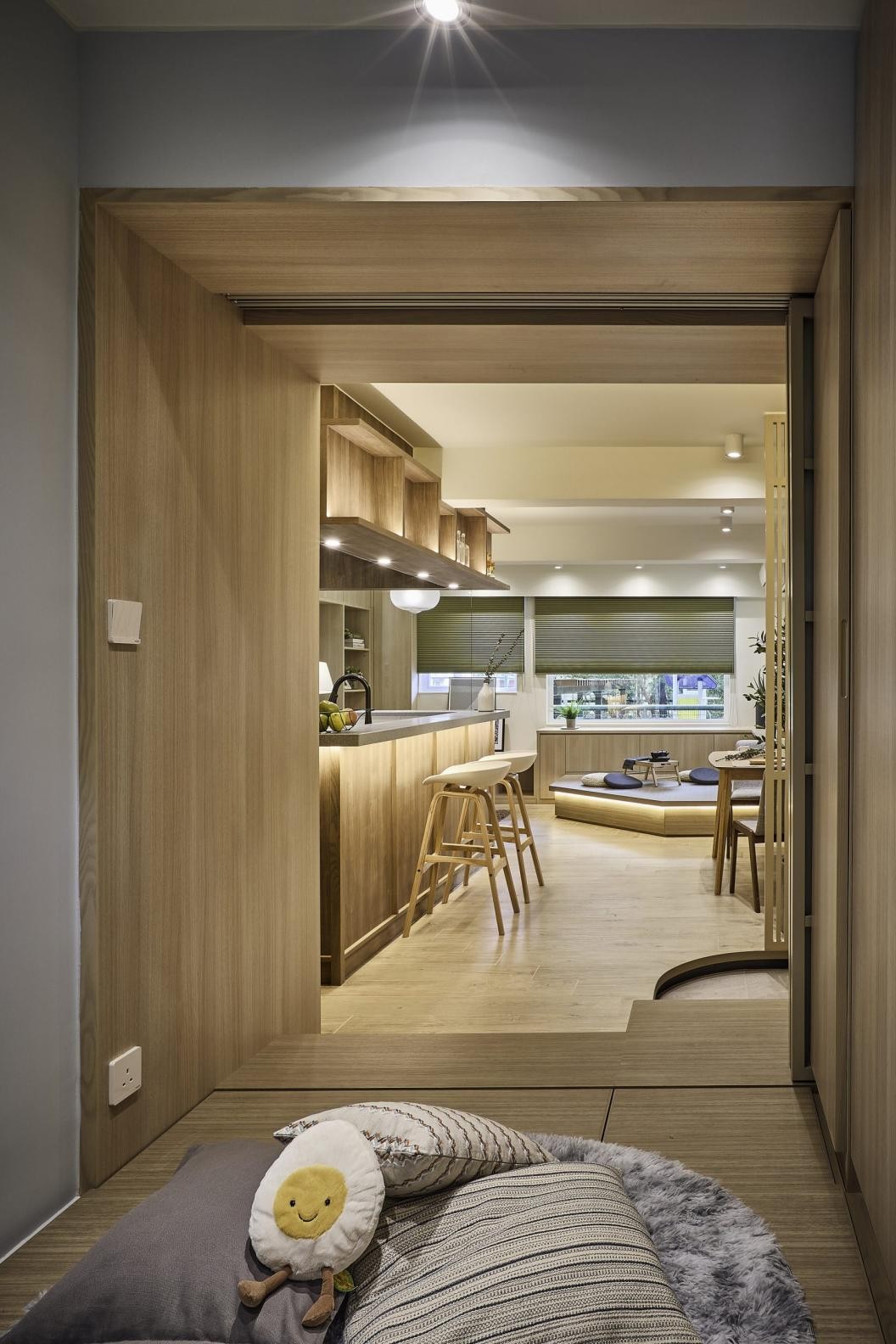 兒童房功能多多,白天可當做孩子的遊樂區,設備齊全,夜晚關上推拉門又成了一個小臥室。推拉門主要採用木框包邊,紙面裝飾,能起到隱蔽作用的同時還有較強的透光性,打開門即可看到客餐廳以及玄關處的布局。