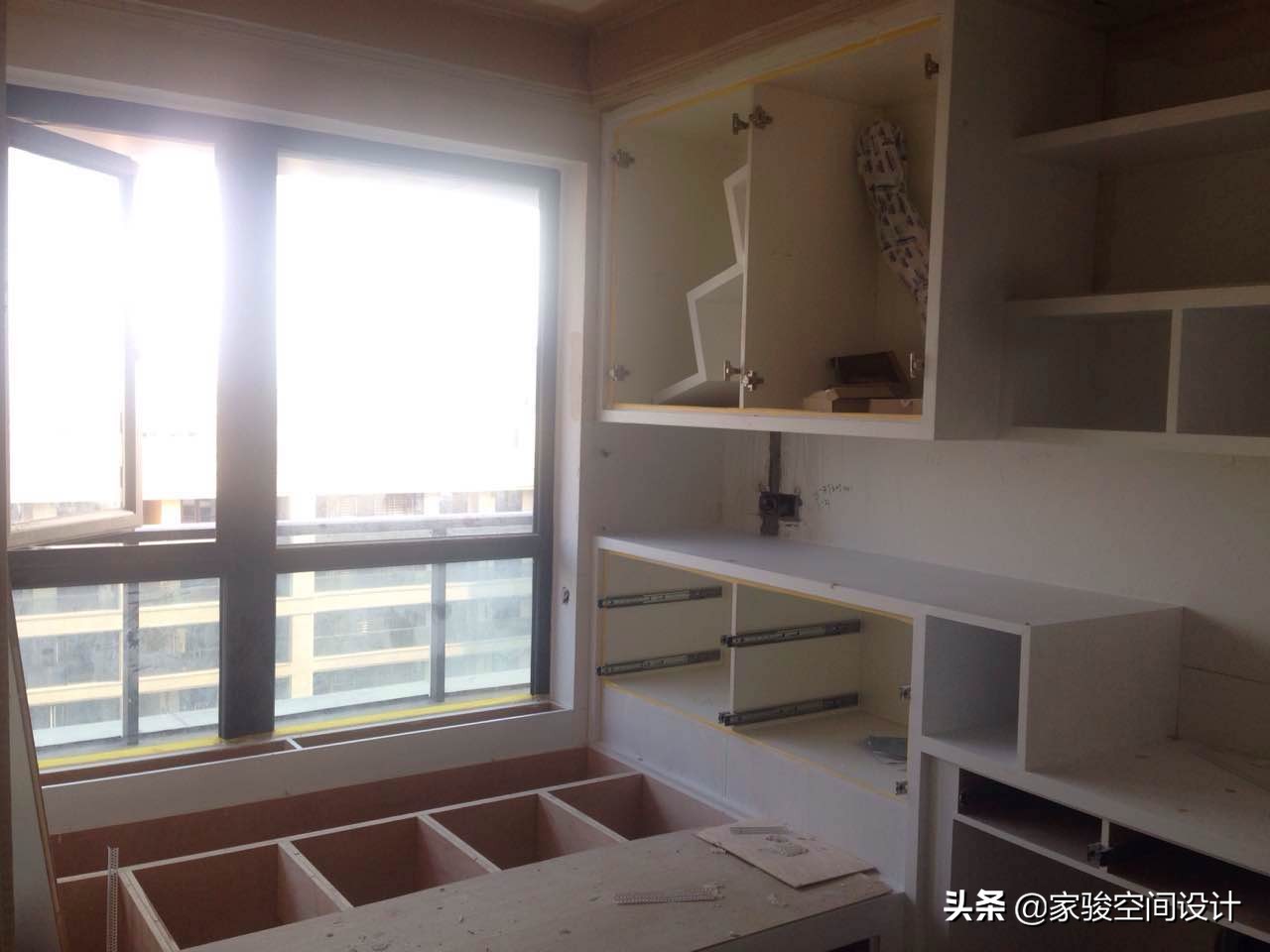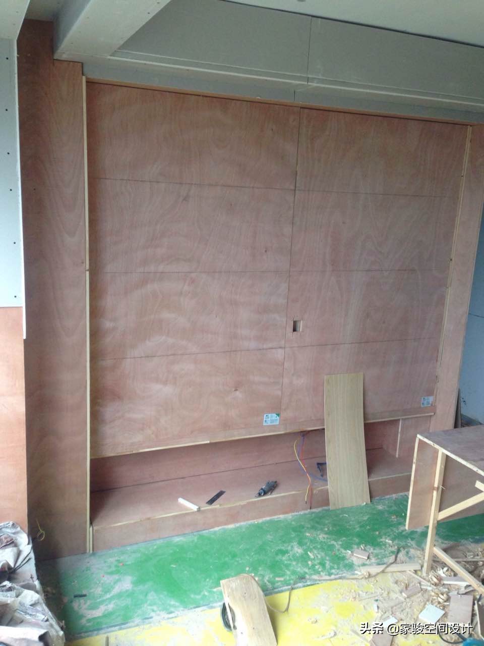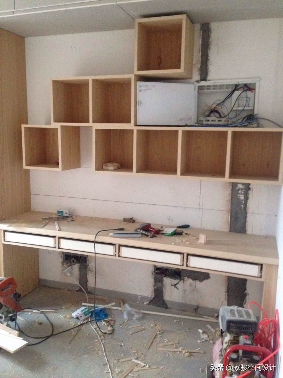施工現場圖片,屋主家的全部櫃子是請了木工在現場製作的。