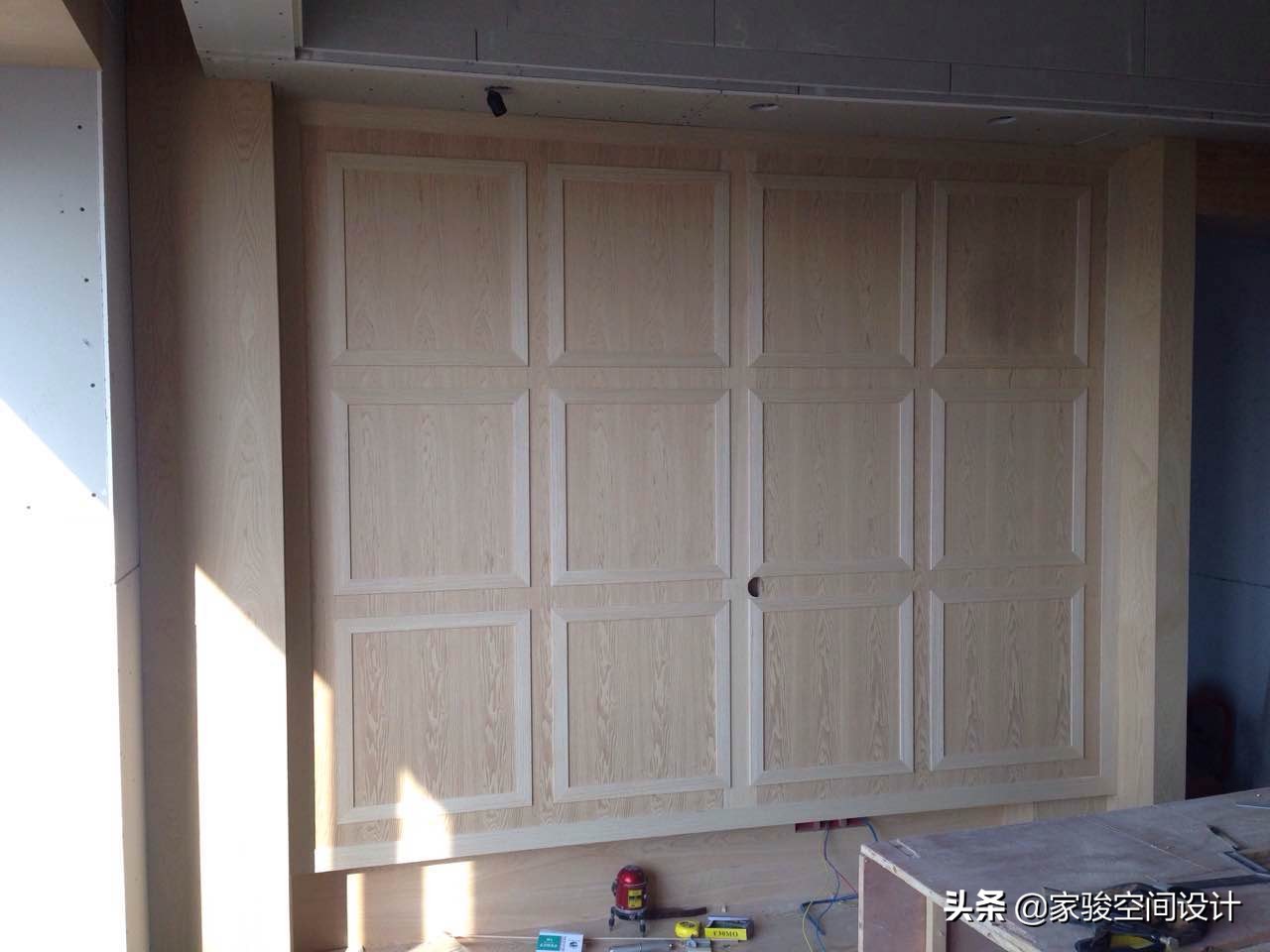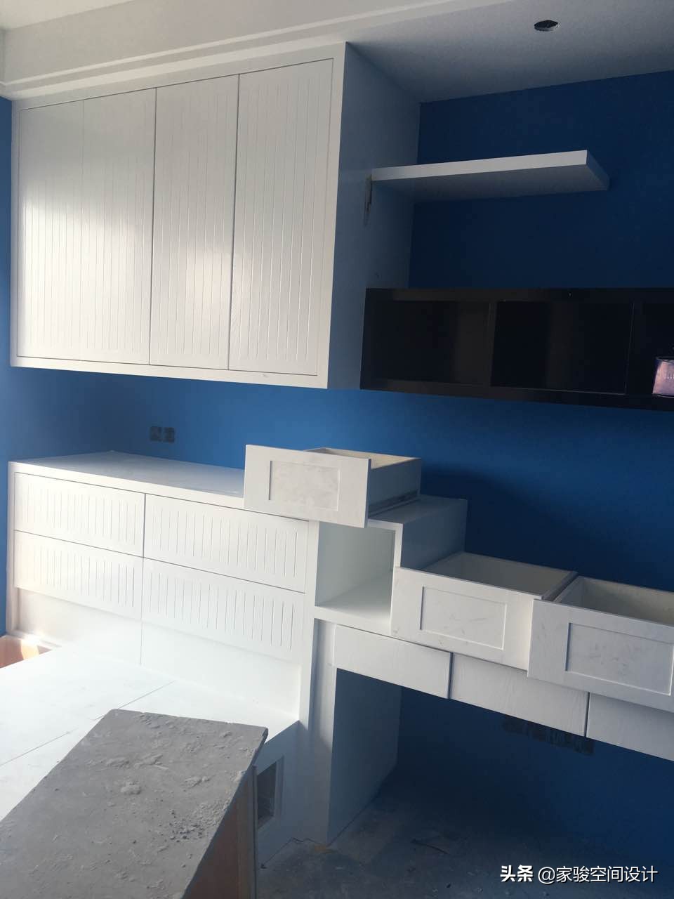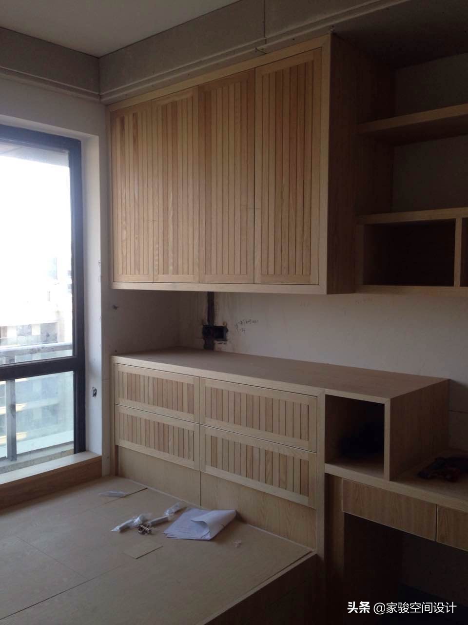 施工現場圖片,屋主家的全部櫃子是請了木工在現場製作的。