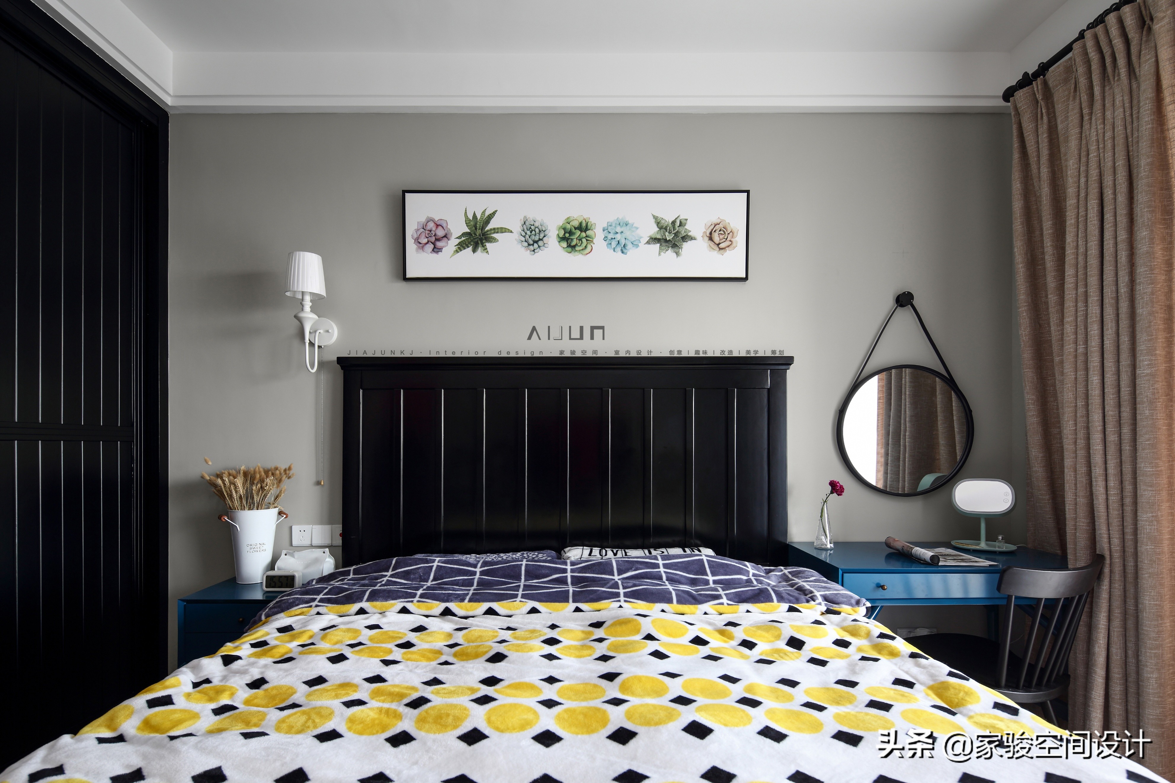 主臥是黑藍黃主色調。正中的床品顏色鮮亮,圖案變化多,中和了大衣櫃和高床頭的沉悶凝重,反襯出了黑色的個性與不羈。整套屋子每個空間的色彩搭配都出人意料。