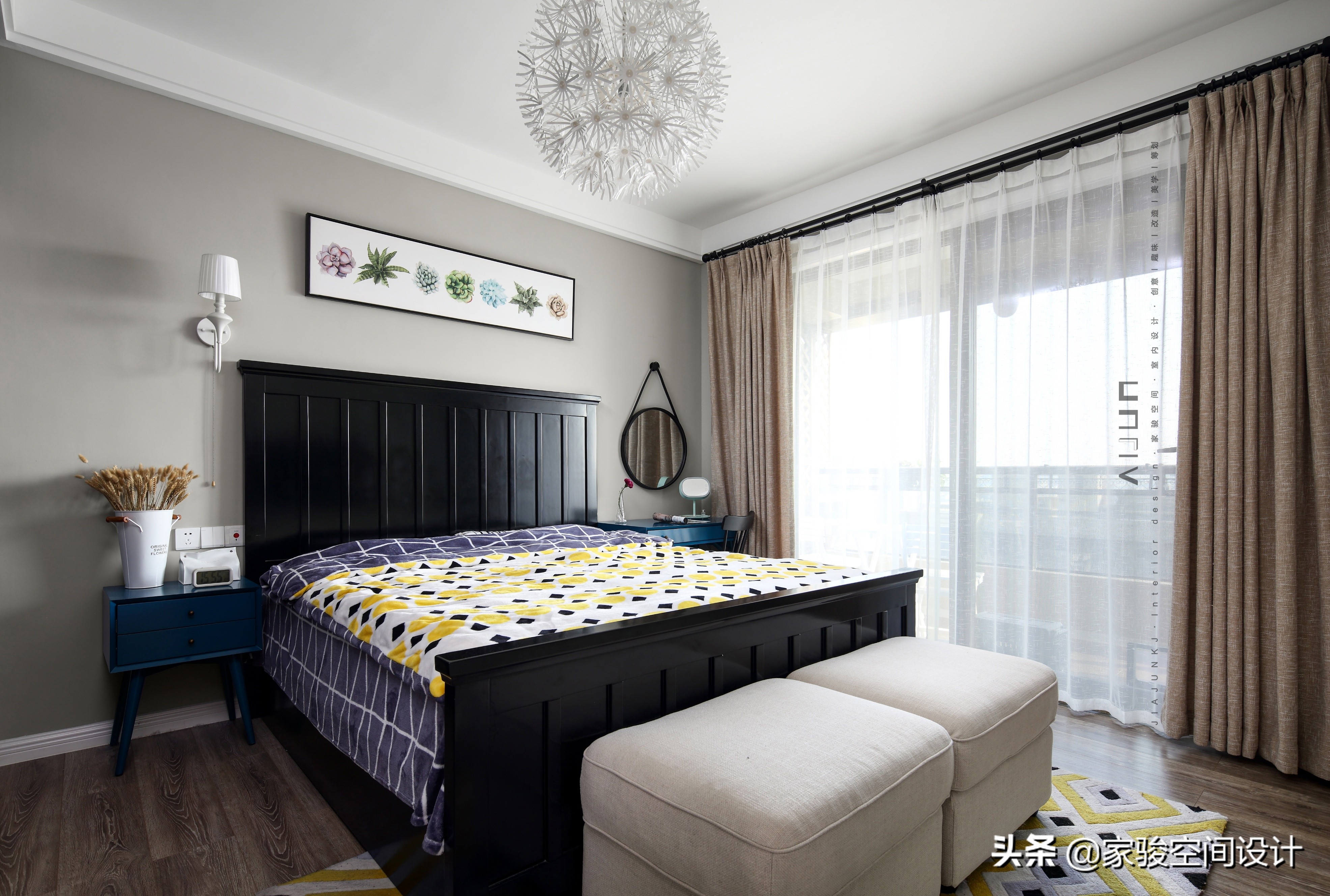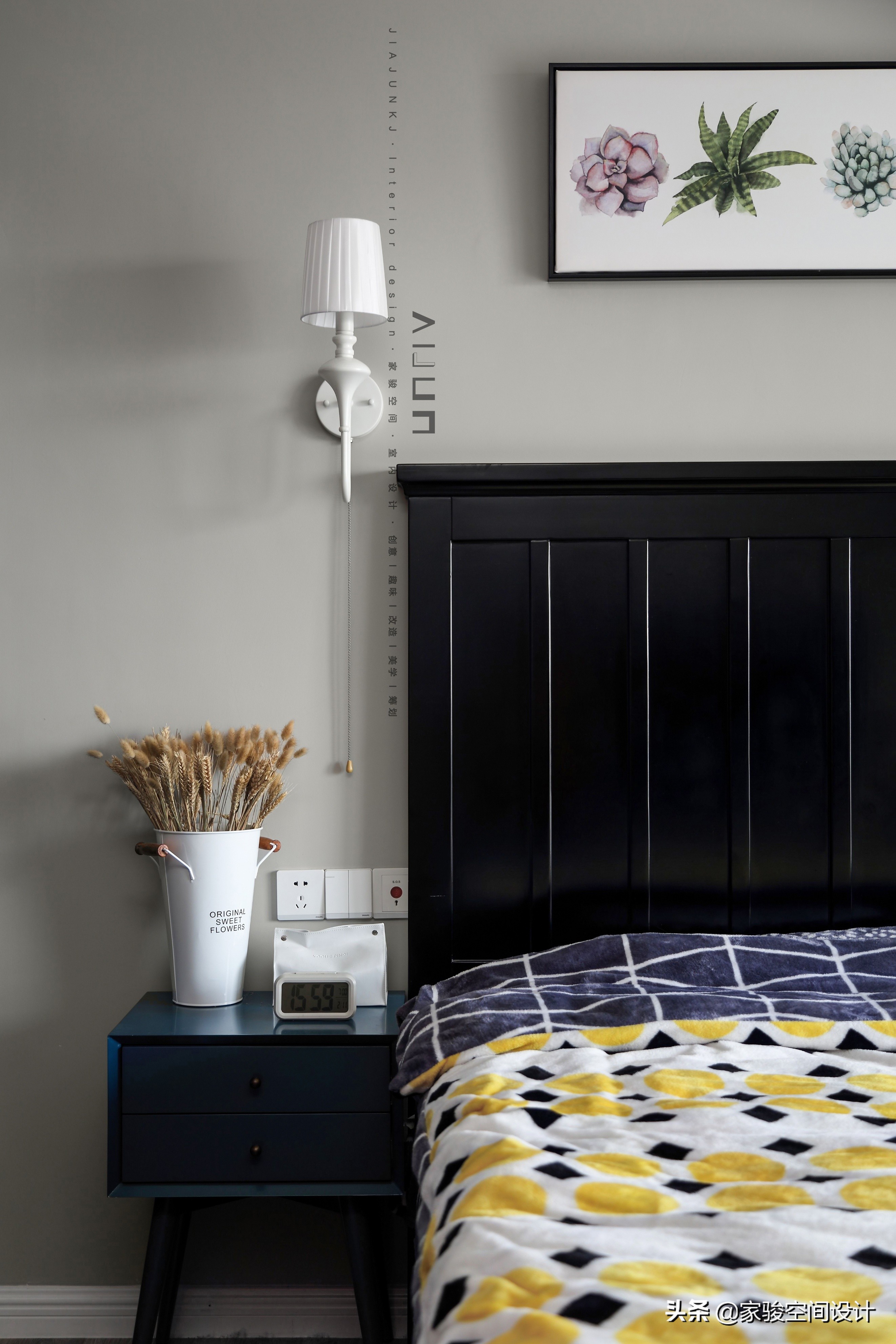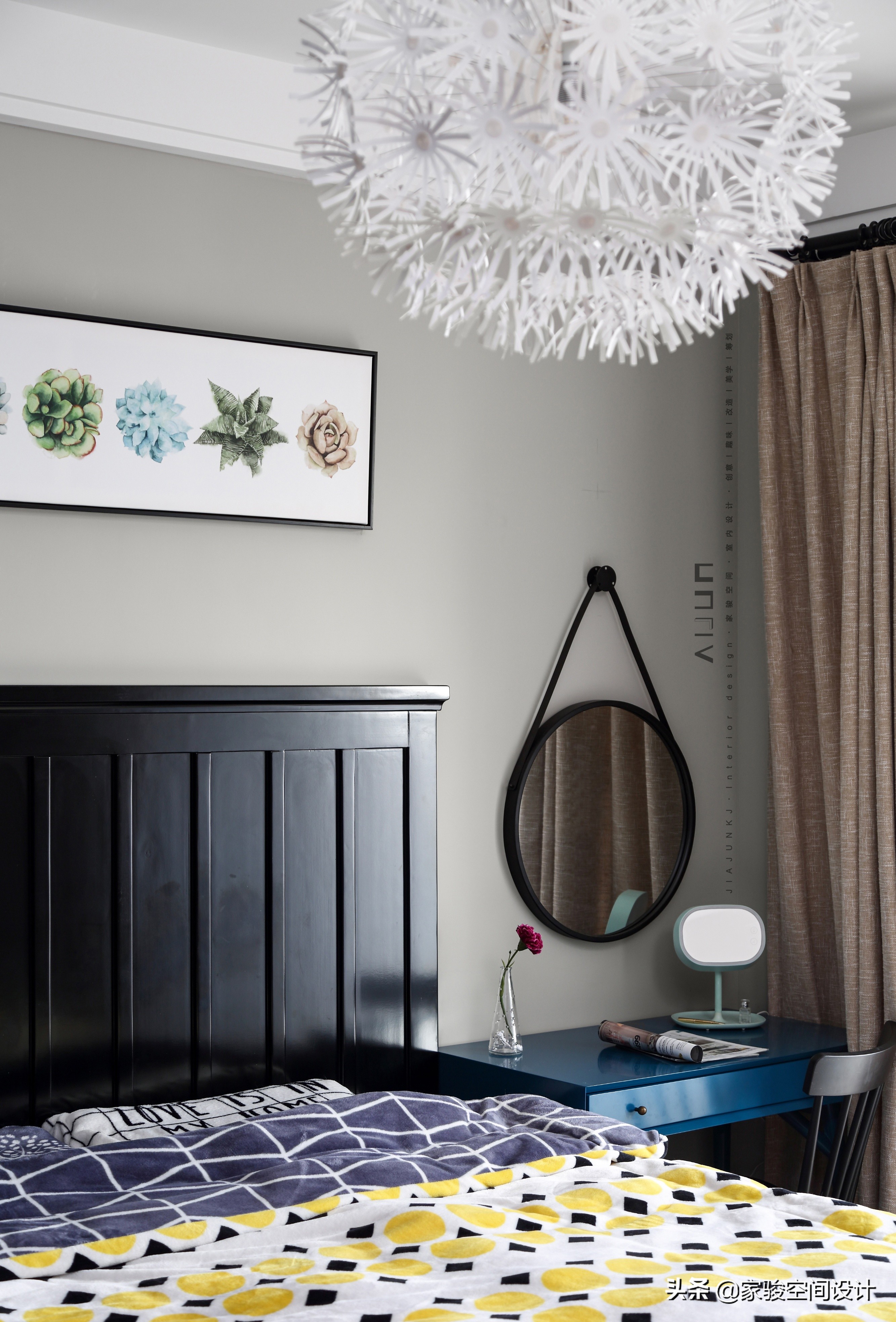 床頭另一角。床頭多肉植物的掛畫清新可愛,和臥室的其他軟裝呼應,減輕了美式家具的厚重感。