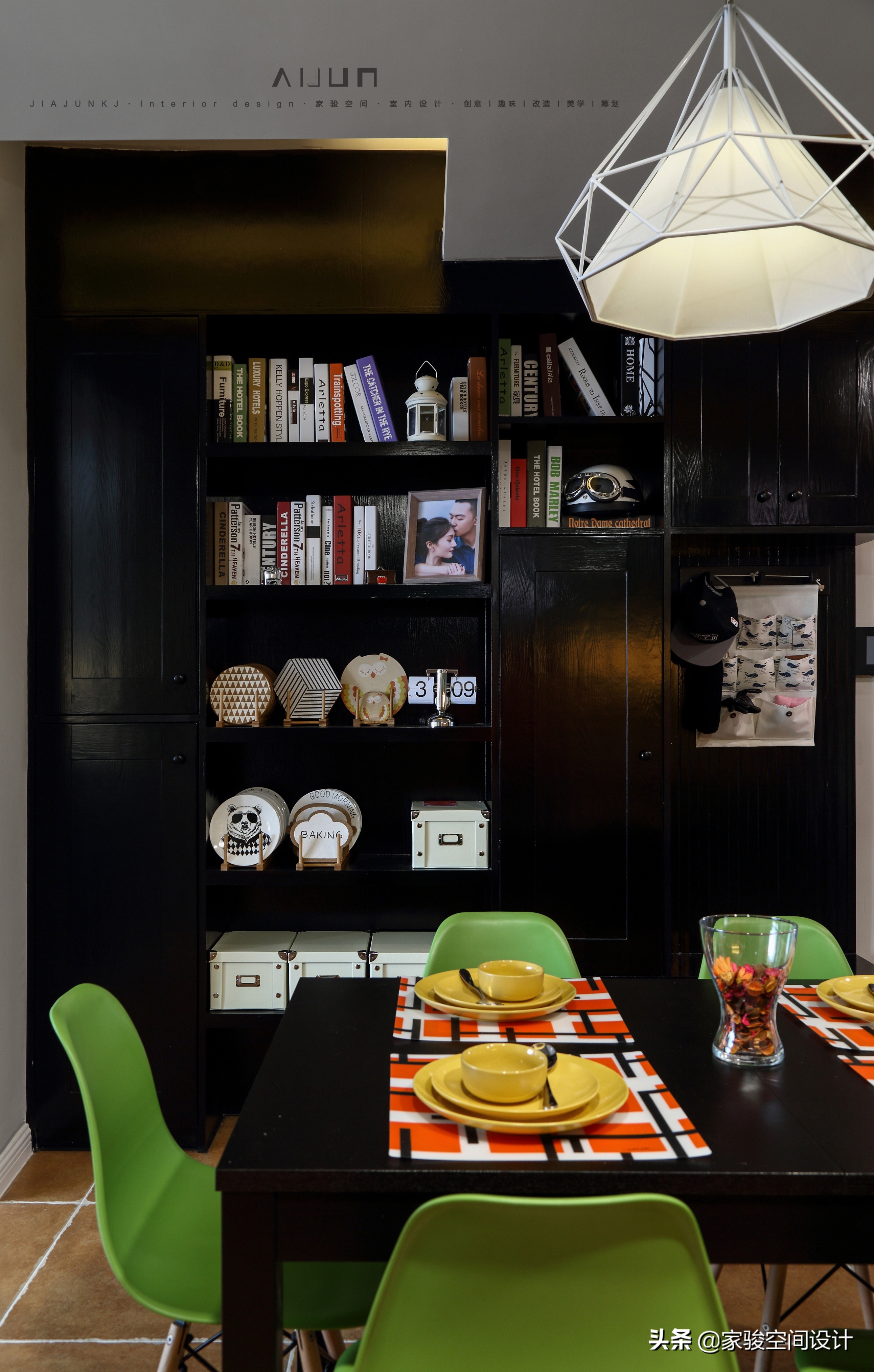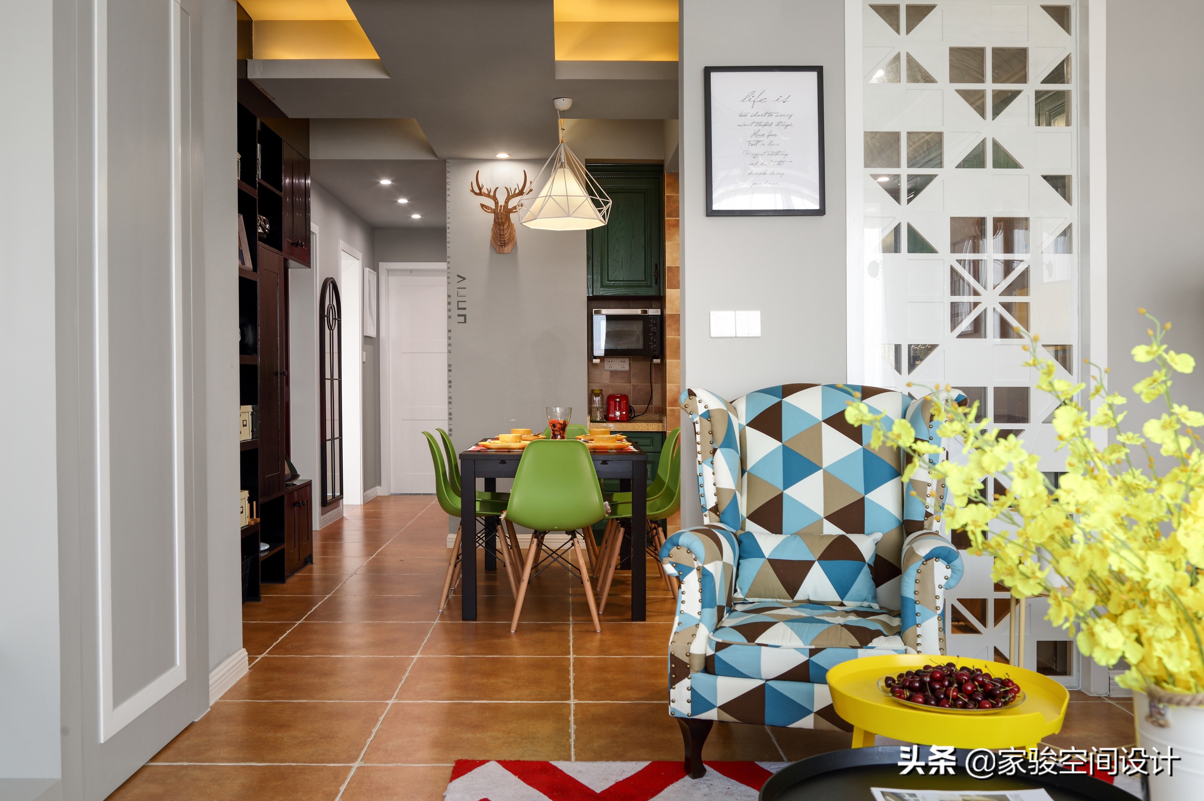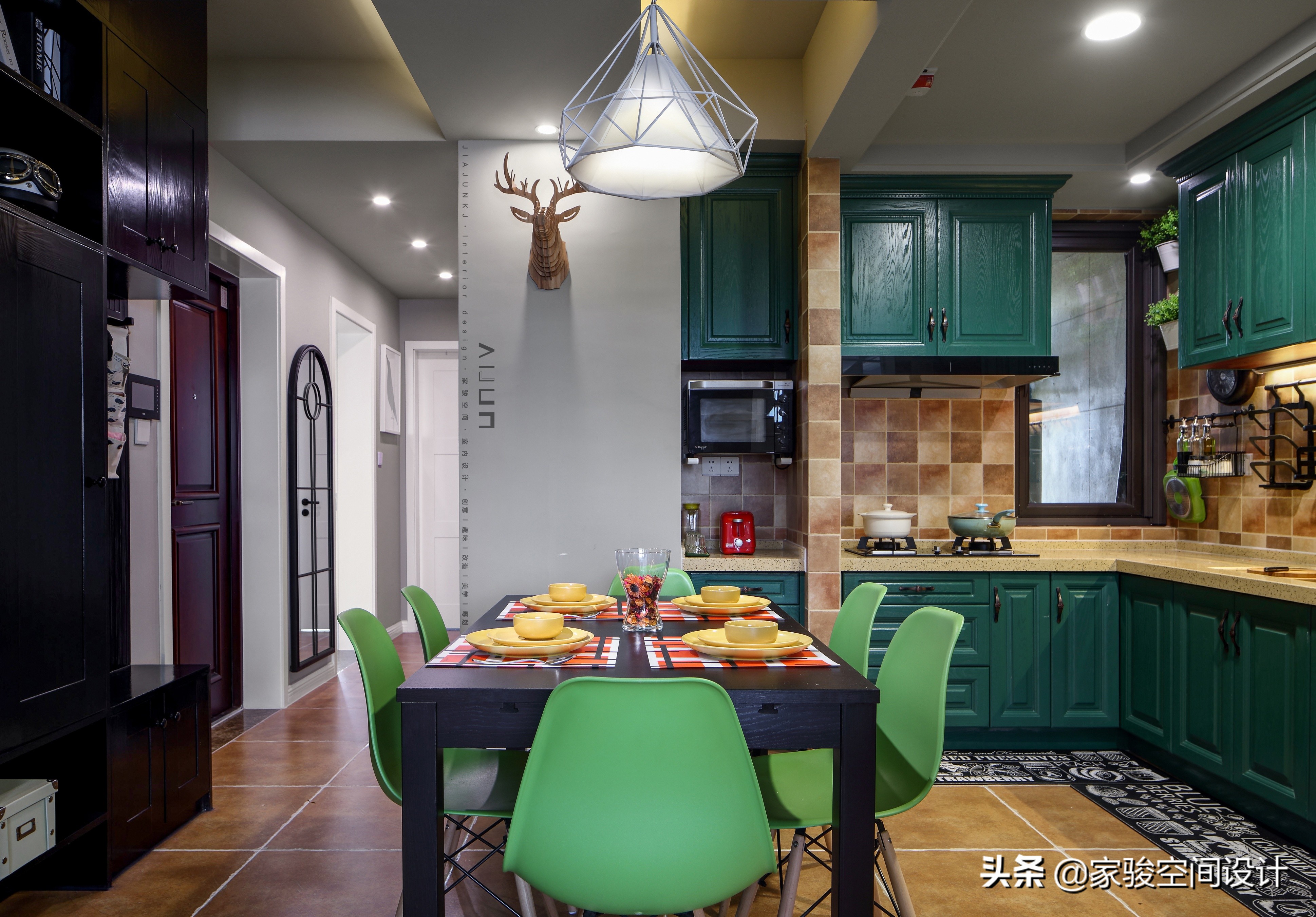 空間統一性處處體現:餐桌和玄關高櫃-黑色;餐椅和櫥櫃-綠色系;馴鹿頭掛件、廚房牆磚和地磚-淺棕黃色;檸檬黃的餐具不但呼應了客廳的黃色,還給規律統一的空間帶來一點有趣的變化。