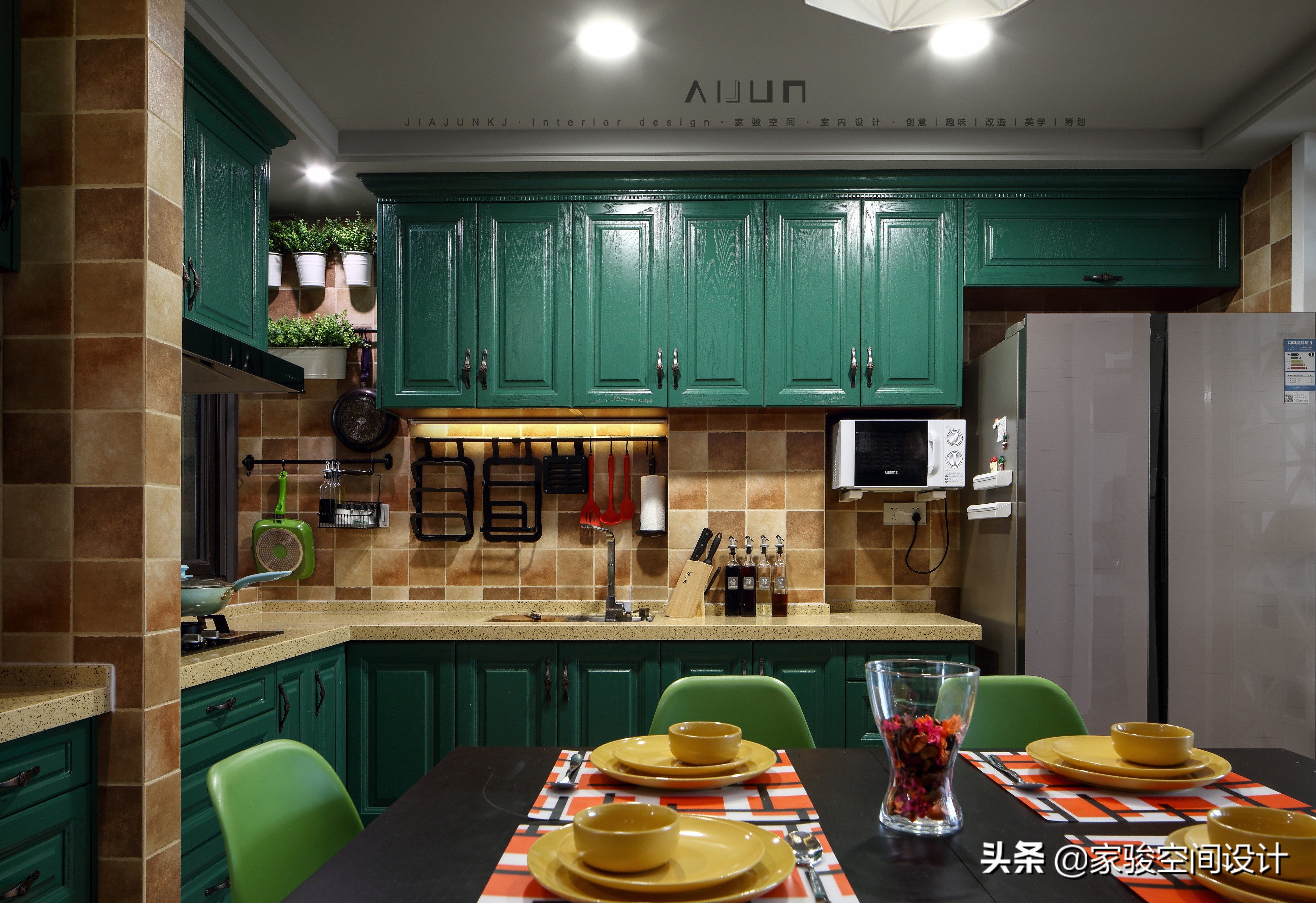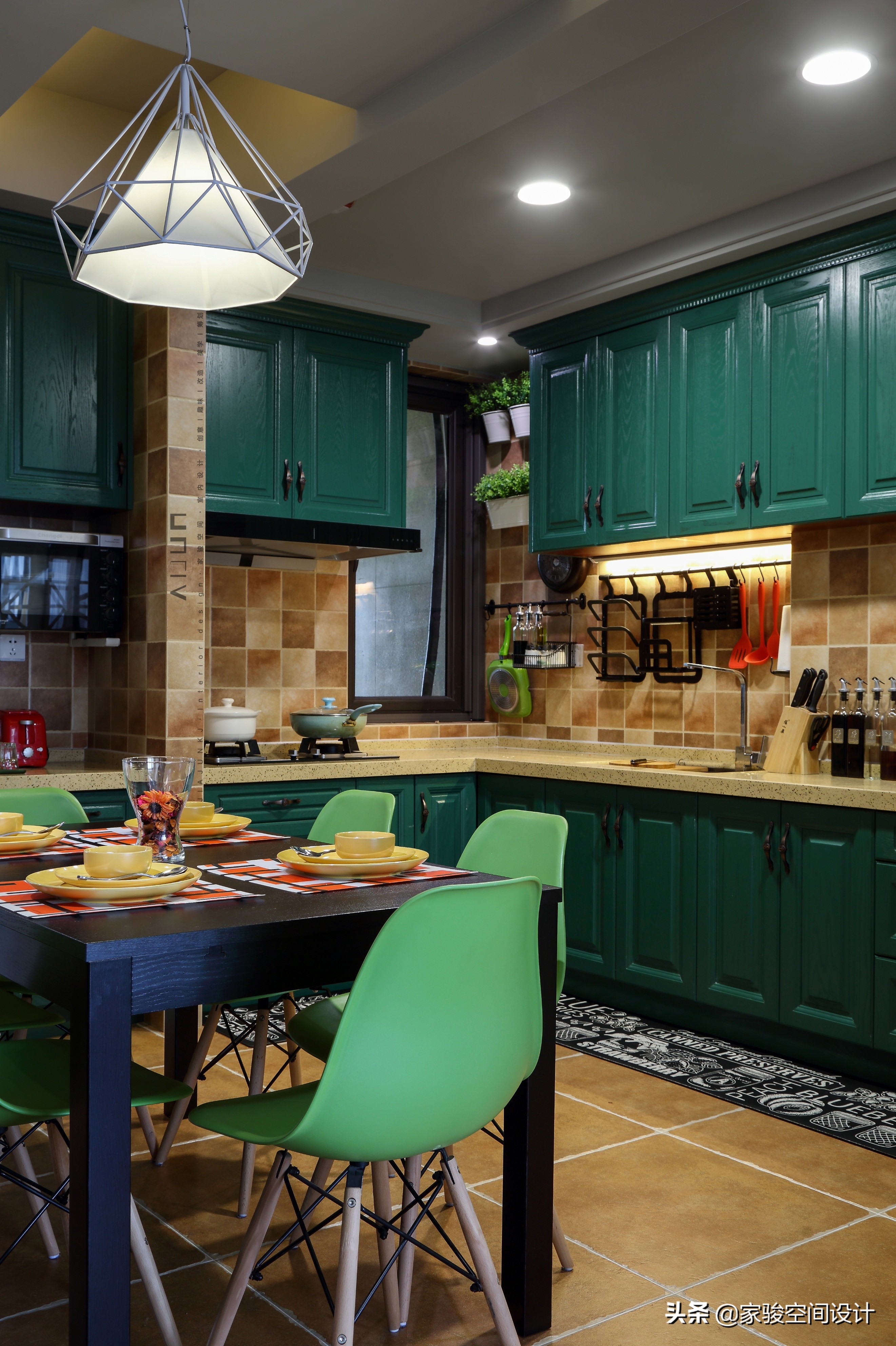 從客廳往前走,是餐廚一體的區域,餐廳就在廚房旁邊。整個餐廚區域依舊是美式和北歐的混搭,主色調是墨綠色和黑色,復古范。