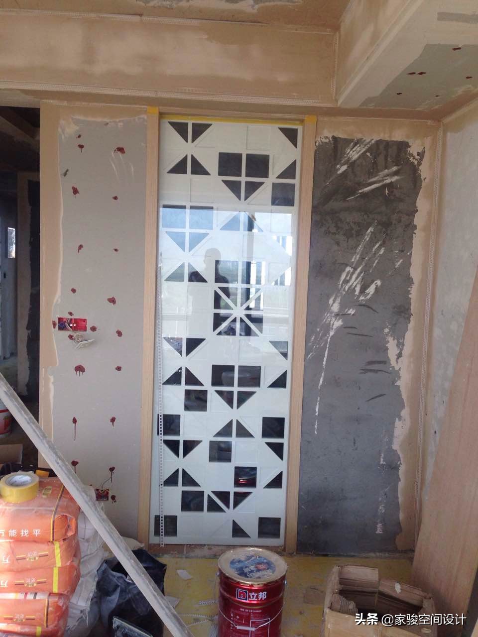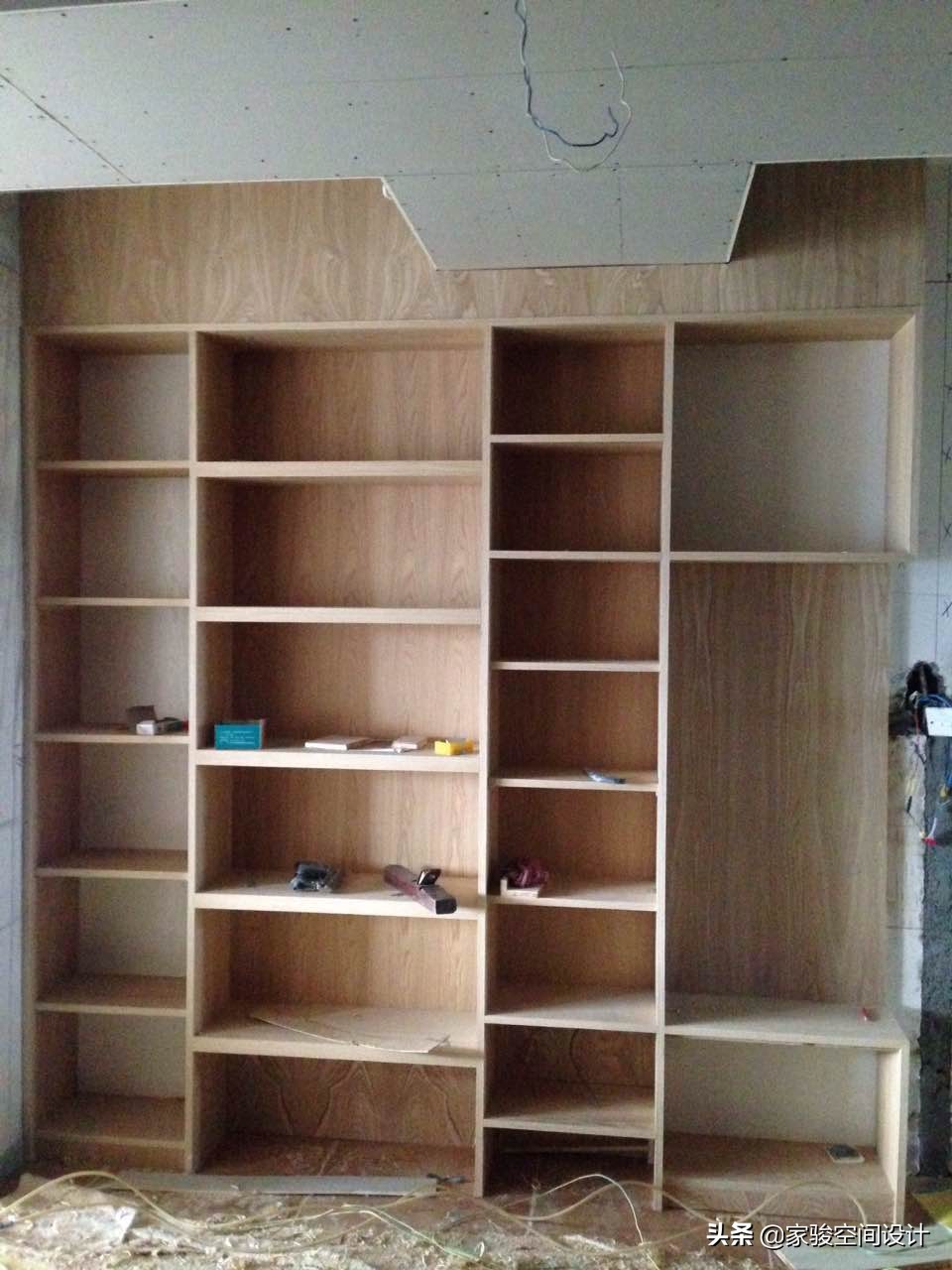 電視背景牆背後是書房,原本書房和客廳的隔斷已拆除,新建了櫃體來做分隔,櫃體後面用輕鋼龍骨搭架子,然後木工板封面,飾面板貼面後再刷油漆,做成了現在電視背景牆的樣子。