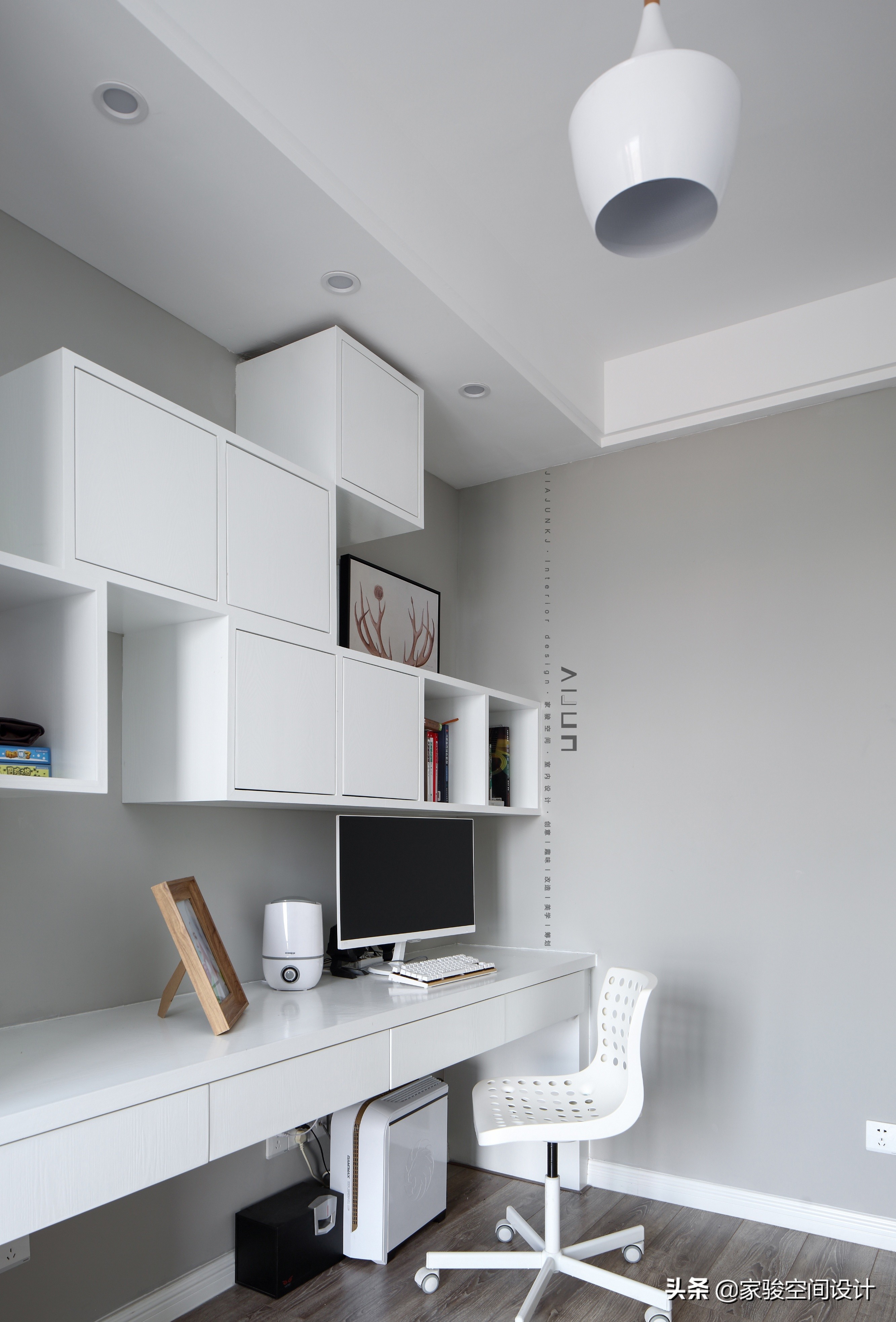 白色和淺灰主色調的書房,簡約素淨,能讓人靜心辦公。