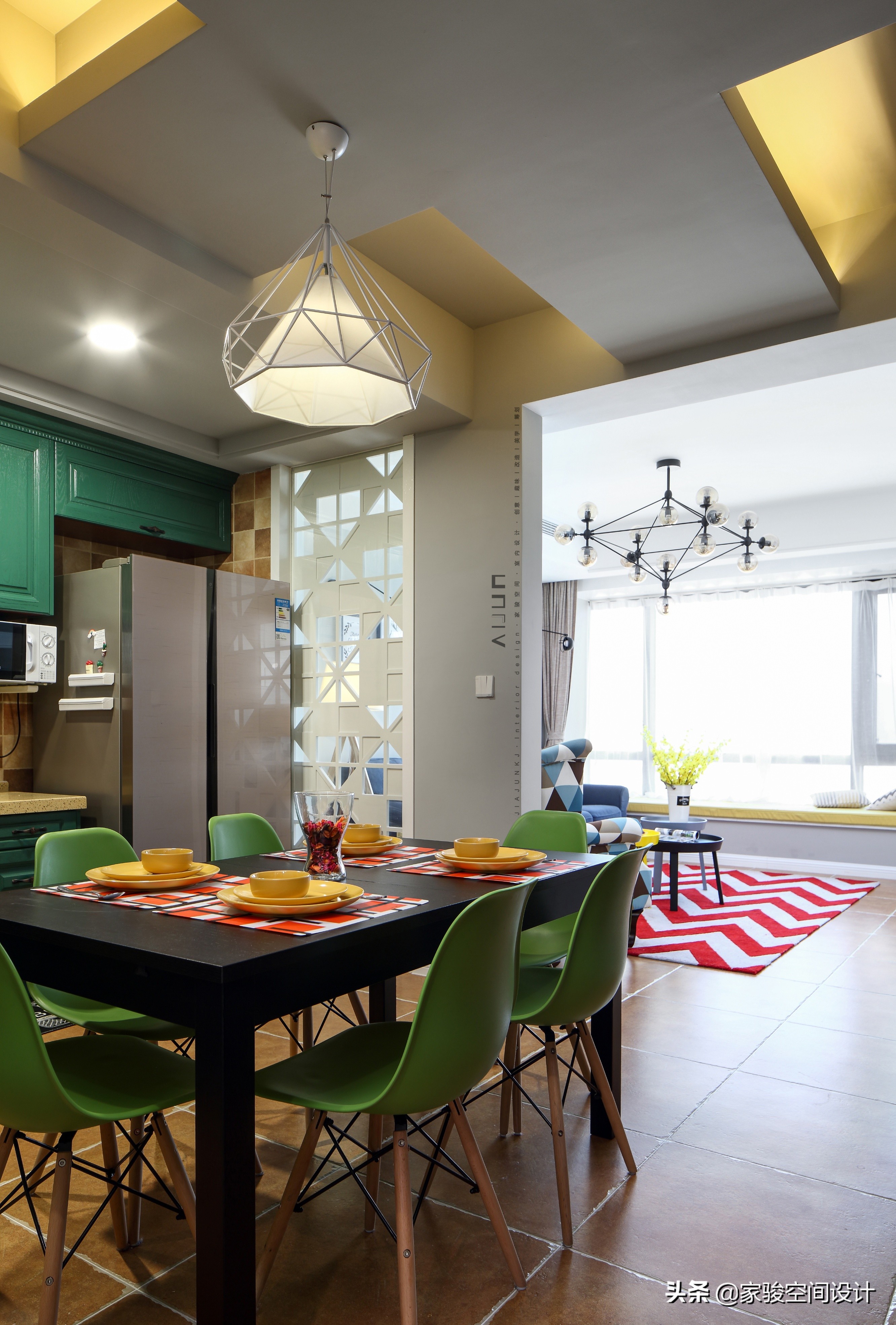 客廳和廚房間用兩個半牆+中間定制隔斷來分隔開,玻璃隔斷可以透光,木板部分定制了三角形和正方形鏤空圖案,繼續重復客廳的幾何元素,精致的統一感。