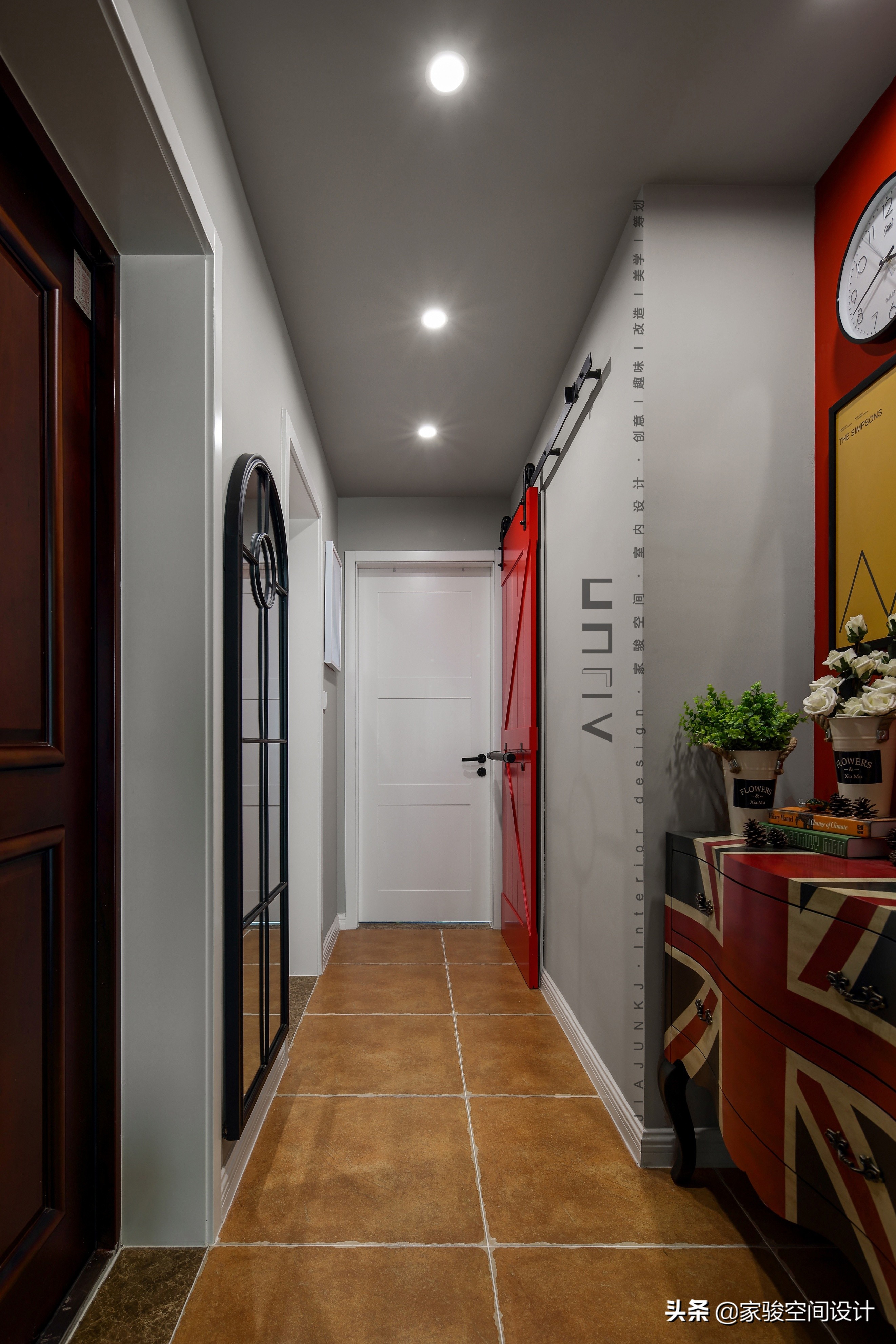 從大門口往小孩房看,拱形鐵藝全身鏡、紅色移動谷倉門,復古的元素反復出現,這里好像時光走廊,推開門,不知會帶我們穿越到哪里。