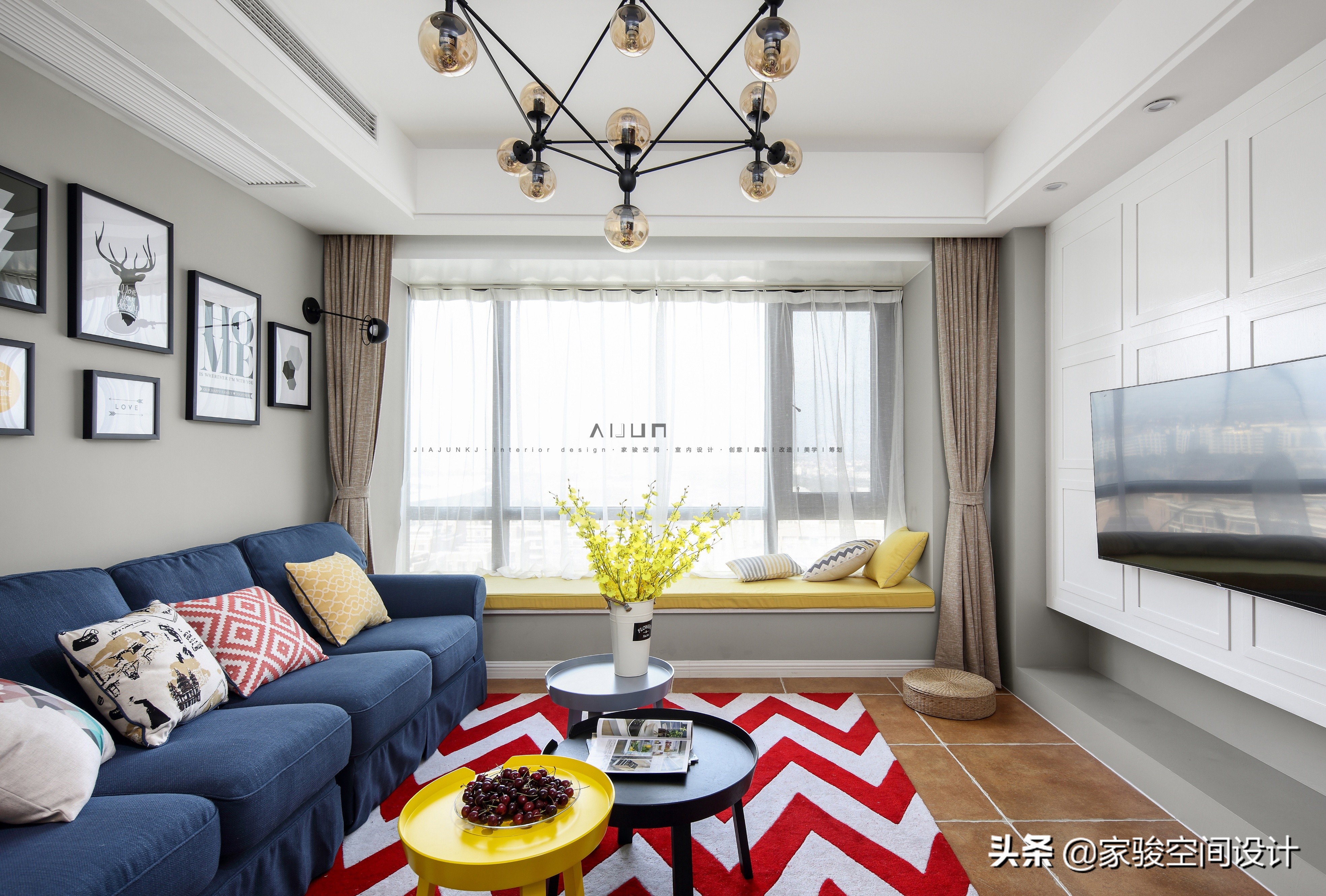 摩豆吊燈簡約有創意。局部吊頂更顯層高,電視背景牆處的筒燈可以做氛圍燈或者補充光源。