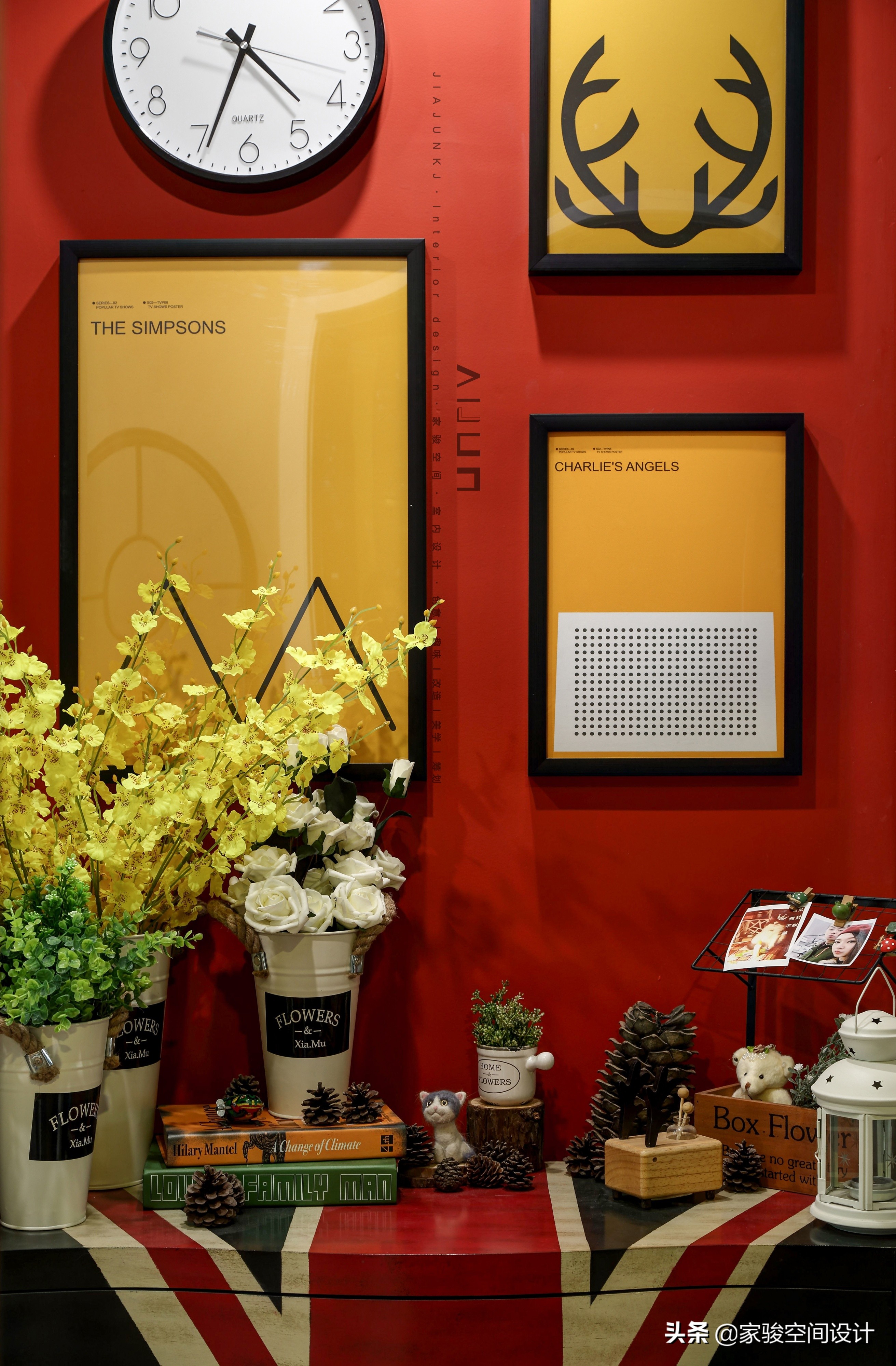 紅藍色飽滿鮮明,所以其他小件軟裝大部分都用黑白灰來平衡。值得一提的是,掛畫系列里還特地安排了一副黃色小畫,空間里統一的呼應感十分有趣。