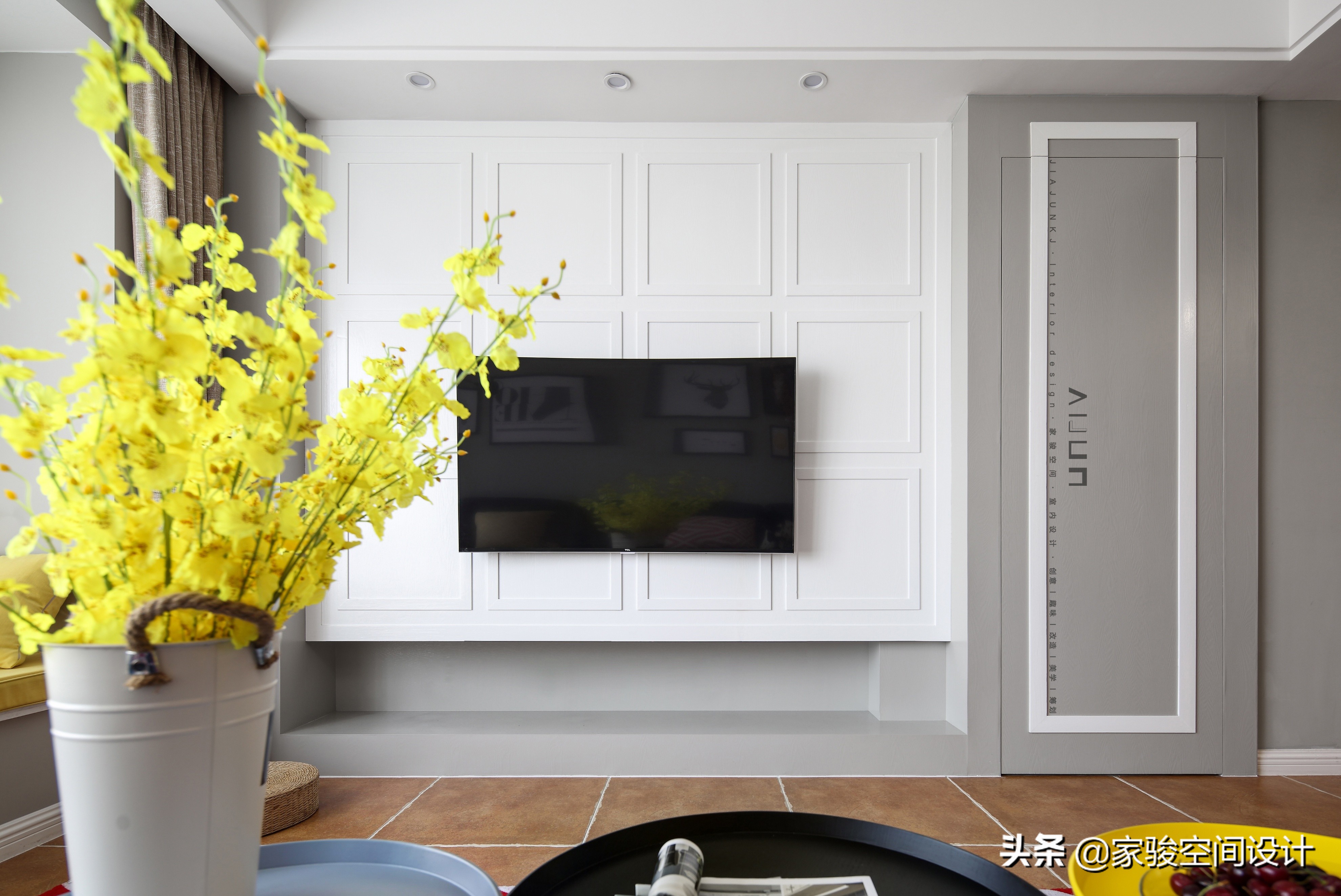 懸空的電視背景牆可以減輕到底的厚重感,然後下面的空格還可以做收納。右邊的隱形門上漂亮的長方形白條,和地磚的白縫、背景牆的方格巧妙的呼應上了,視覺舒適。