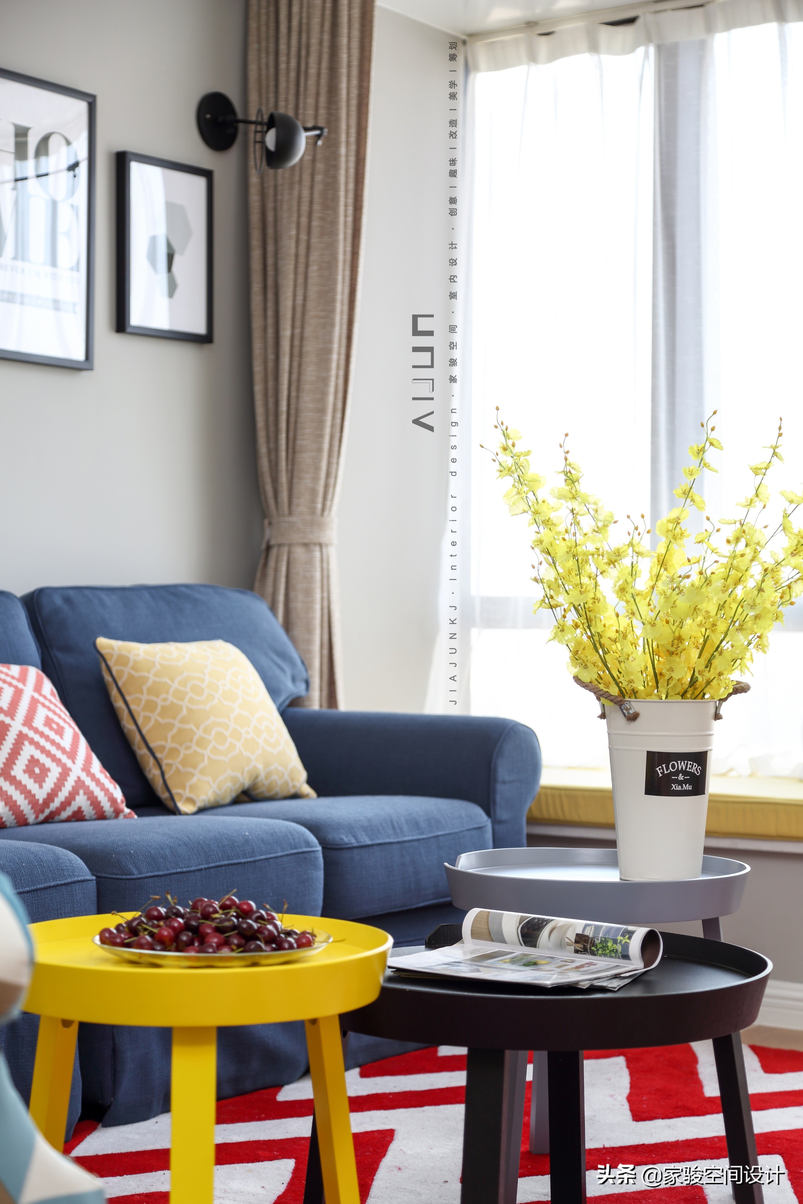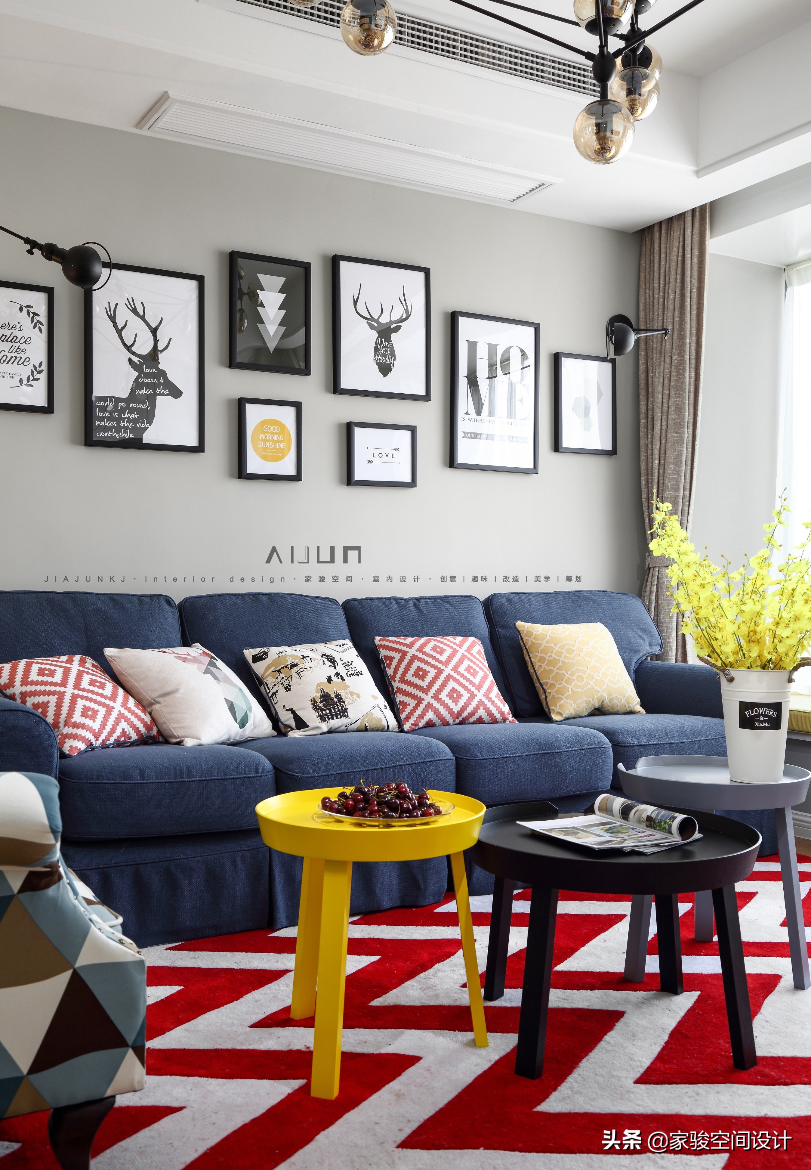 藍色的布藝沙發和美式鄉村沙發有著厚實的質感,紅色Z字紋地毯明快熱烈,一大捧跳舞蘭帶來陽光般的鮮亮和生氣。