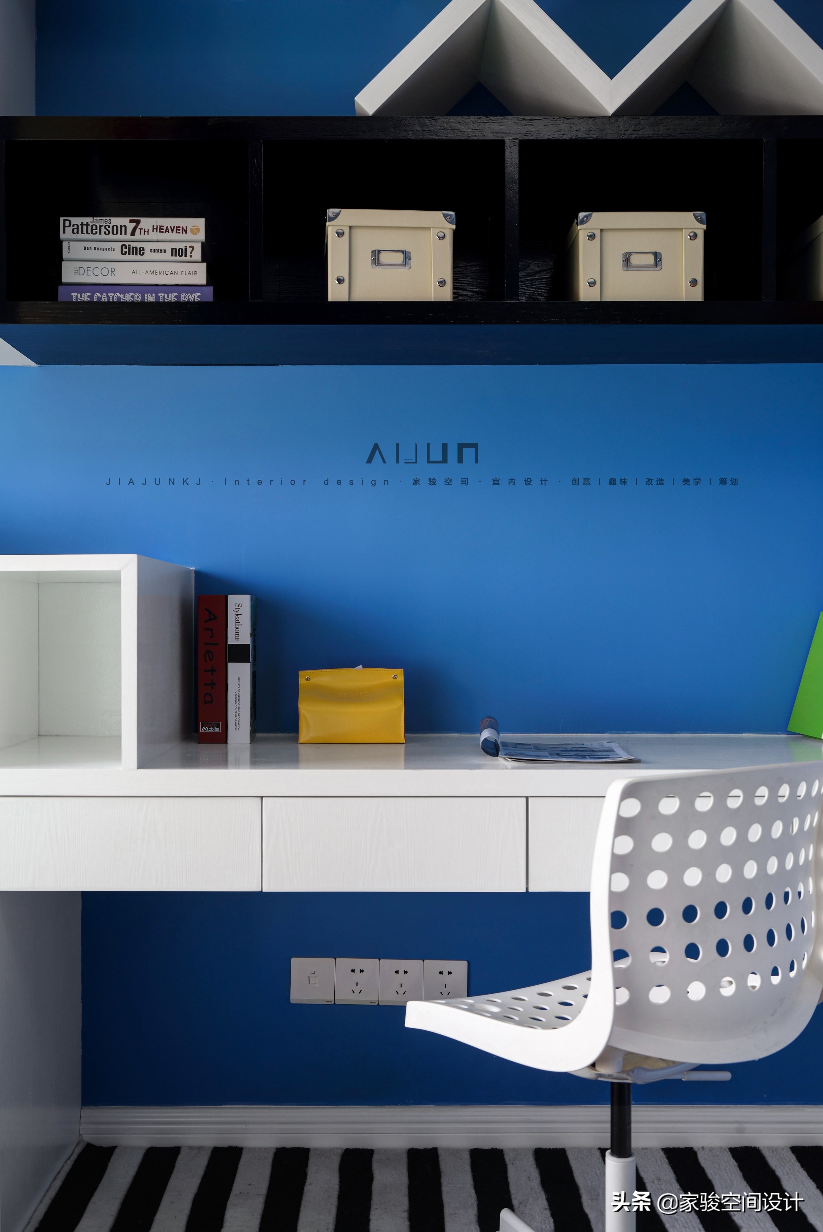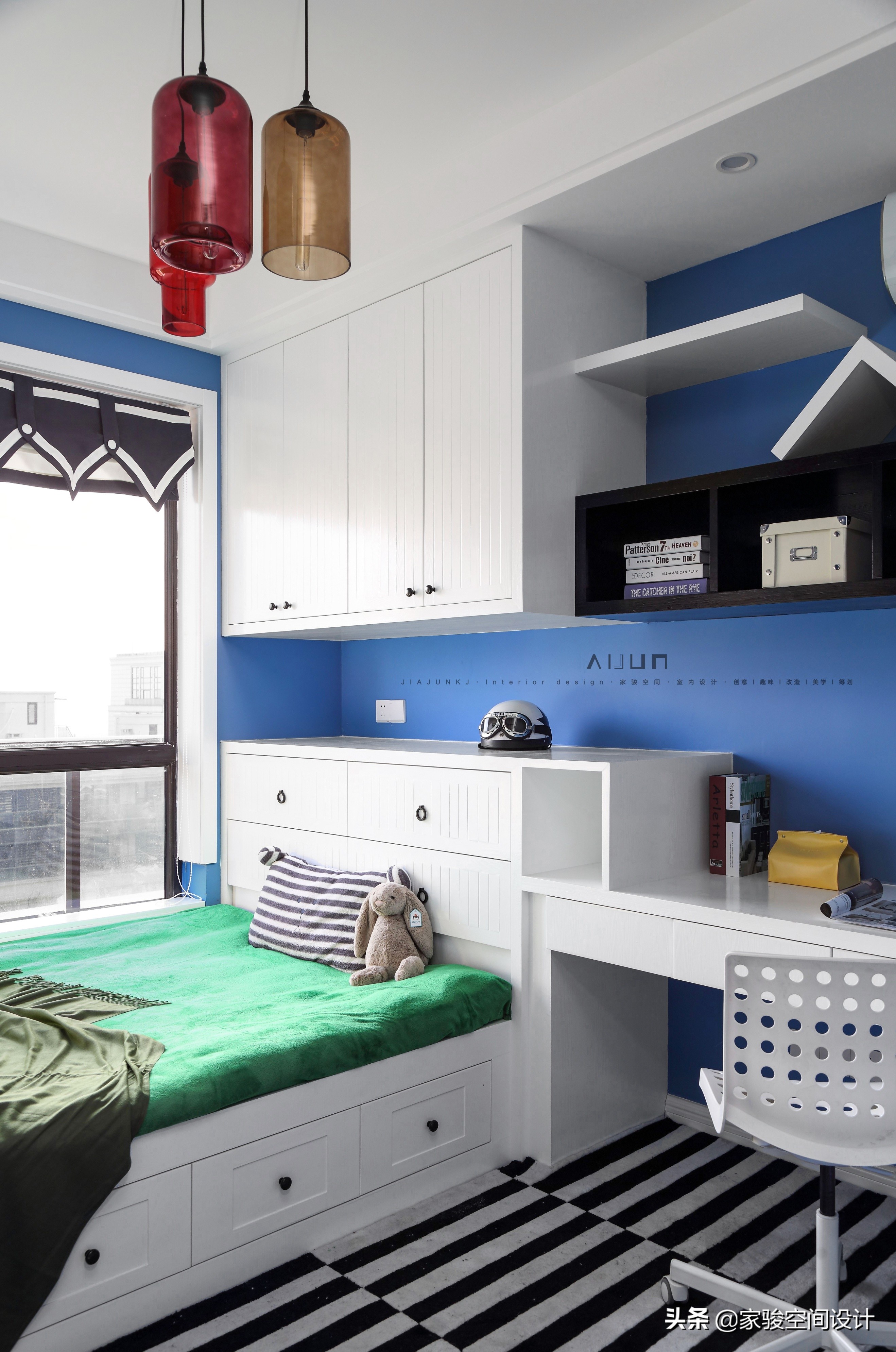 兒童房是藍白主色調,地毯用了黑白條紋,為小主人特意打造的海洋主題。