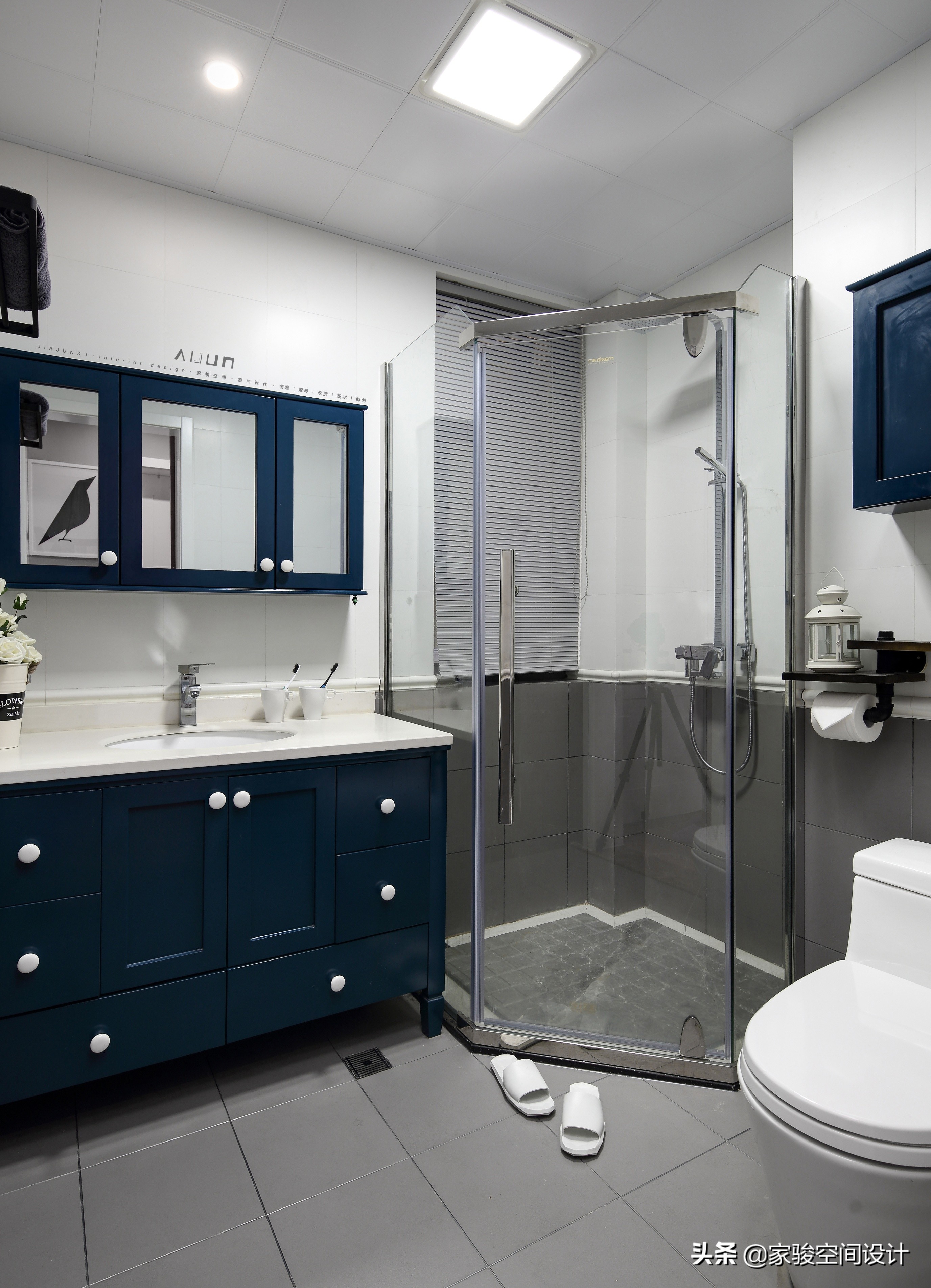 廁所用了整體浴室,方便幹濕分離。藍色美式浴室櫃和灰色地磚呼應主體風格色調。