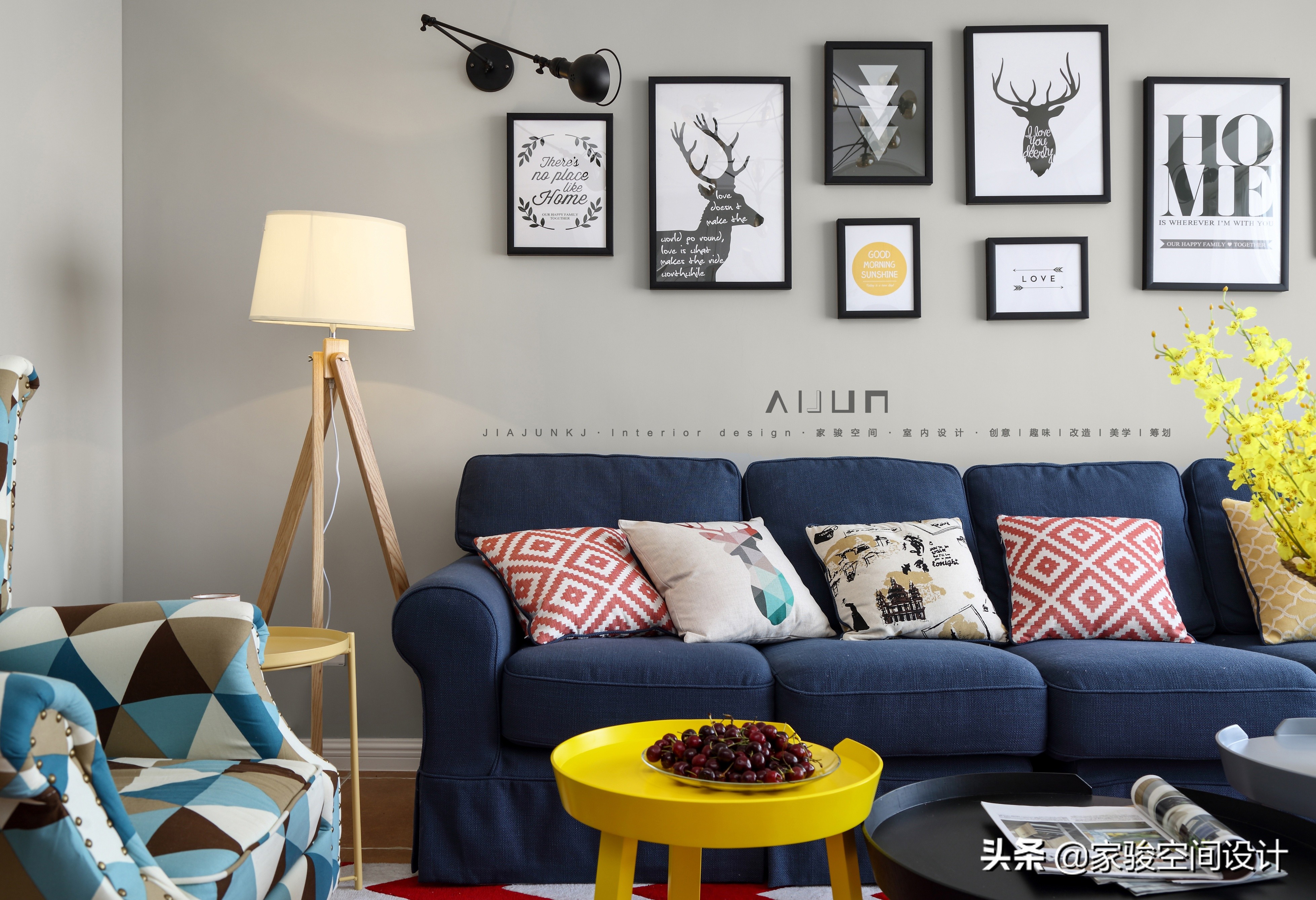 客廳混搭了美式和北歐的元素,色彩上比北歐濃重,家具量感上比美式輕巧,協調的糅合了兩種風格。