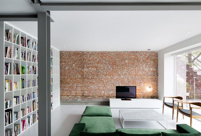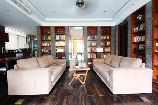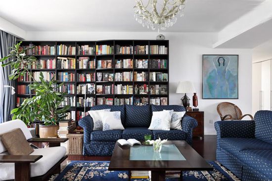 裝飾tips:家里的藏書太多了,小書架根本滿足不了,只有大型的書架才能把這些書都整整齊齊地收納起來。 延伸書架寬度與牆面緊貼,讓書架與牆融為一體,這樣的客廳空間,哪里都可以變成閱讀區。