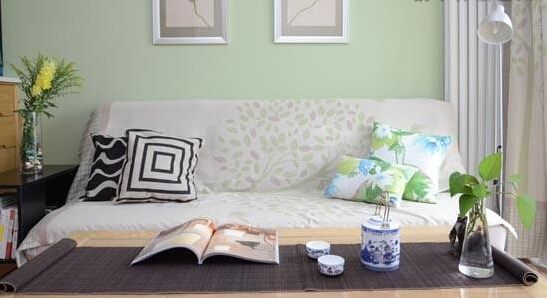 裝飾tips:沙發會客區搖身一變變成了閱讀空間,印有植物圖案的布藝沙發和清新的綠色牆面讓室內沉浸在一片美好春色中,令人賞心悅目,心情愉快。在氤氳的茶香里享受一天的閱讀時光,也非常不錯。