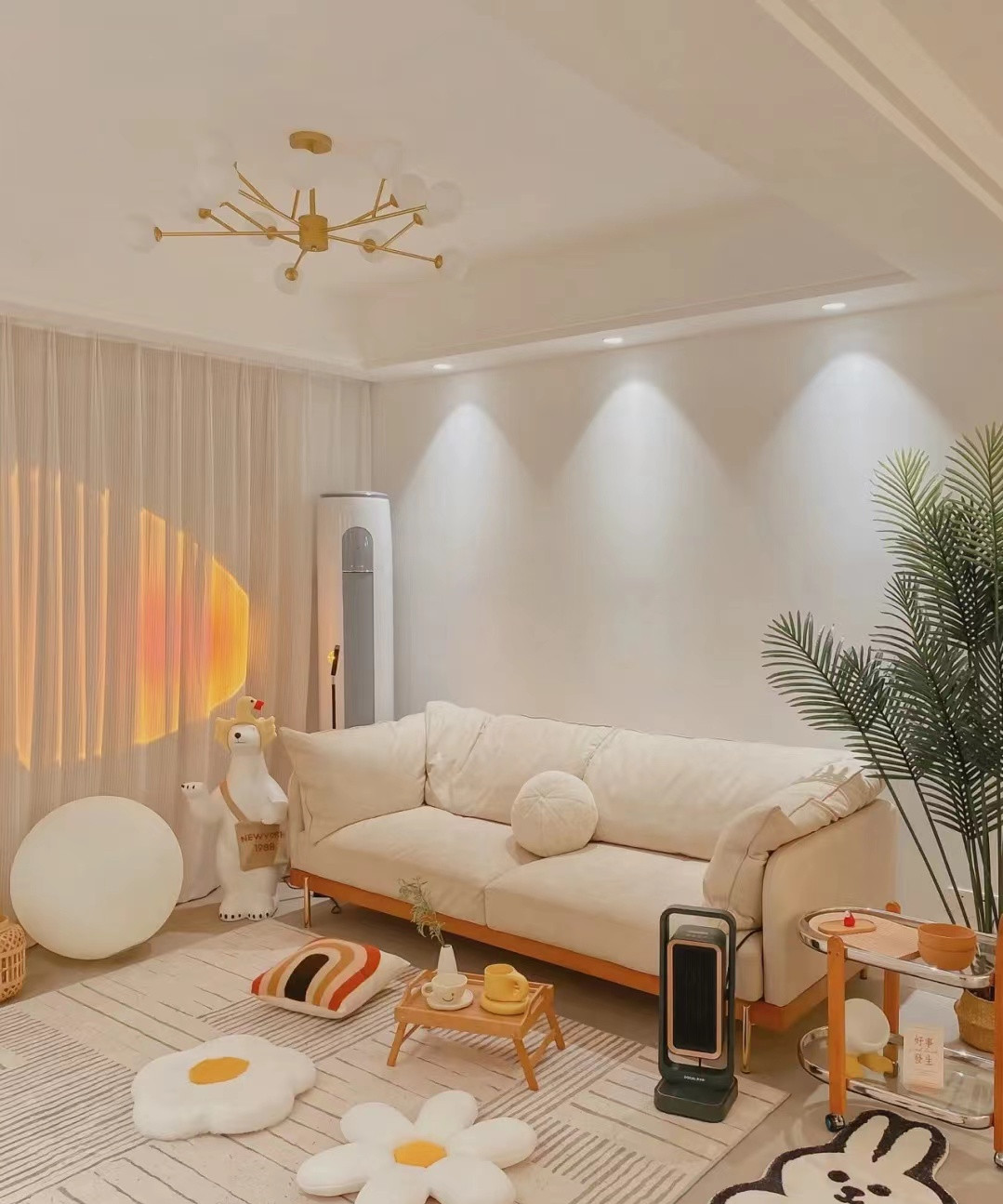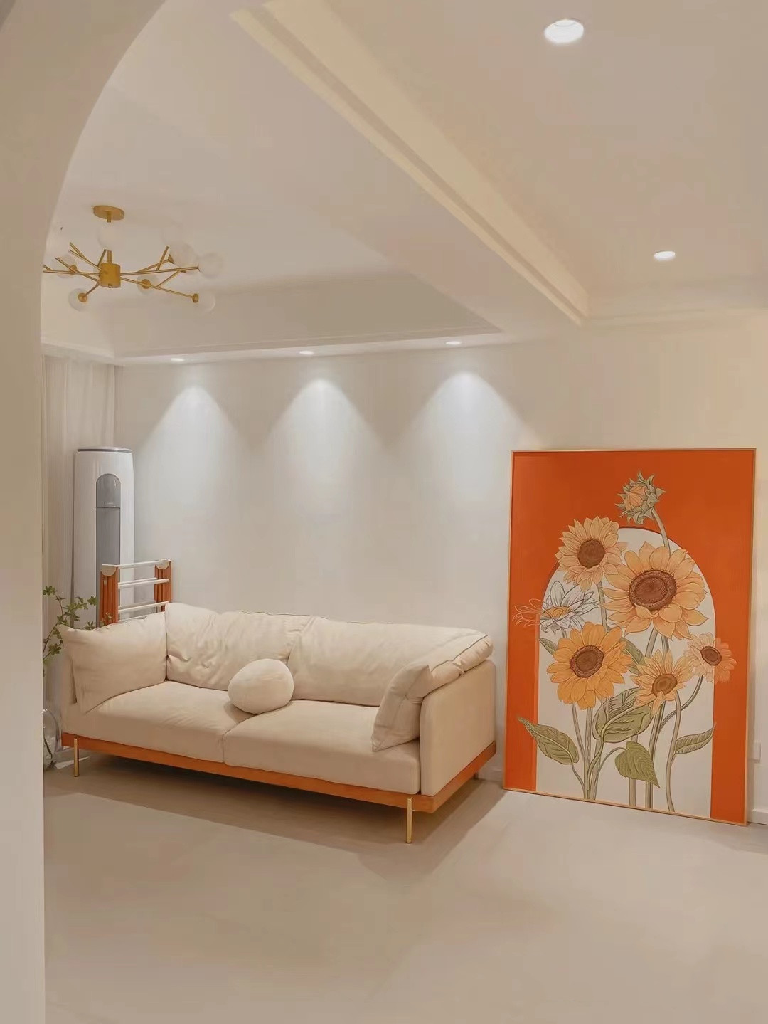沙發背景牆就是以簡單的大白牆為主,沒有做任何造型和裝飾,簡單大方,乾淨利落,搭配一張米色拼接橘黃色矮腳沙發和米色地毯,增添了幾分溫暖的氣息,加上一些軟裝飾,比如花朵和荷包蛋靠枕,又多了幾分趣味和俏皮,沙發一旁擺放了一張向日葵裝飾畫,寓意積極向上,朝氣蓬勃,看著就很溫暖。