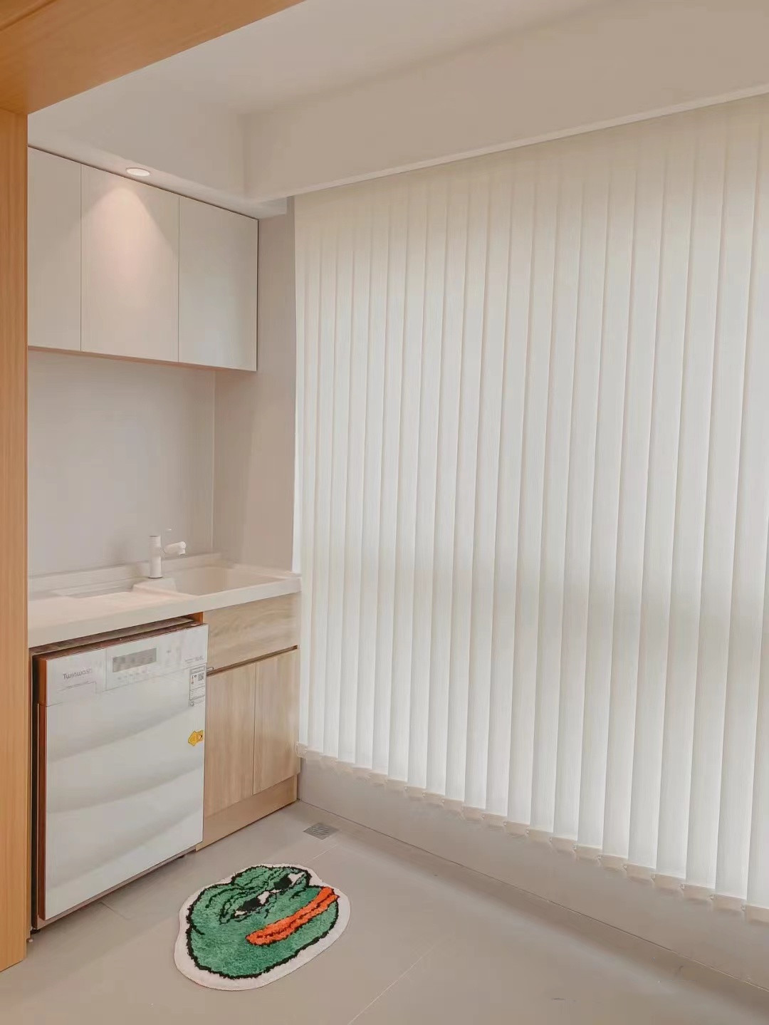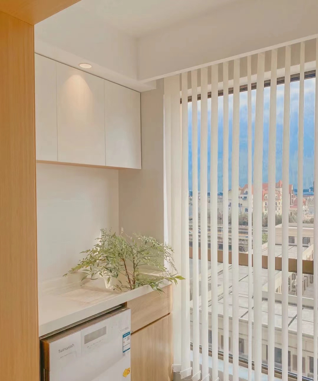 陽台裝了百葉窗簾,可以自由調節光線,美極了,側面定制了一個洗衣櫃,把洗衣機嵌入櫃子下方,節省了不少空間,台面安裝了水龍頭,平時也可以在這里手洗,其他的櫃子則用來存放洗滌用品,增加儲物功能。