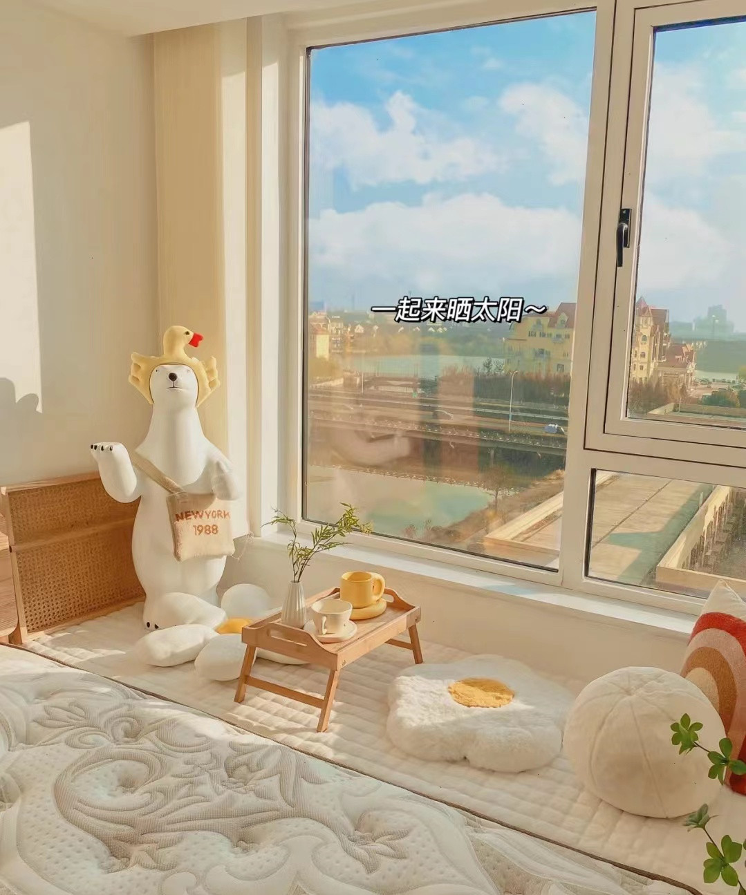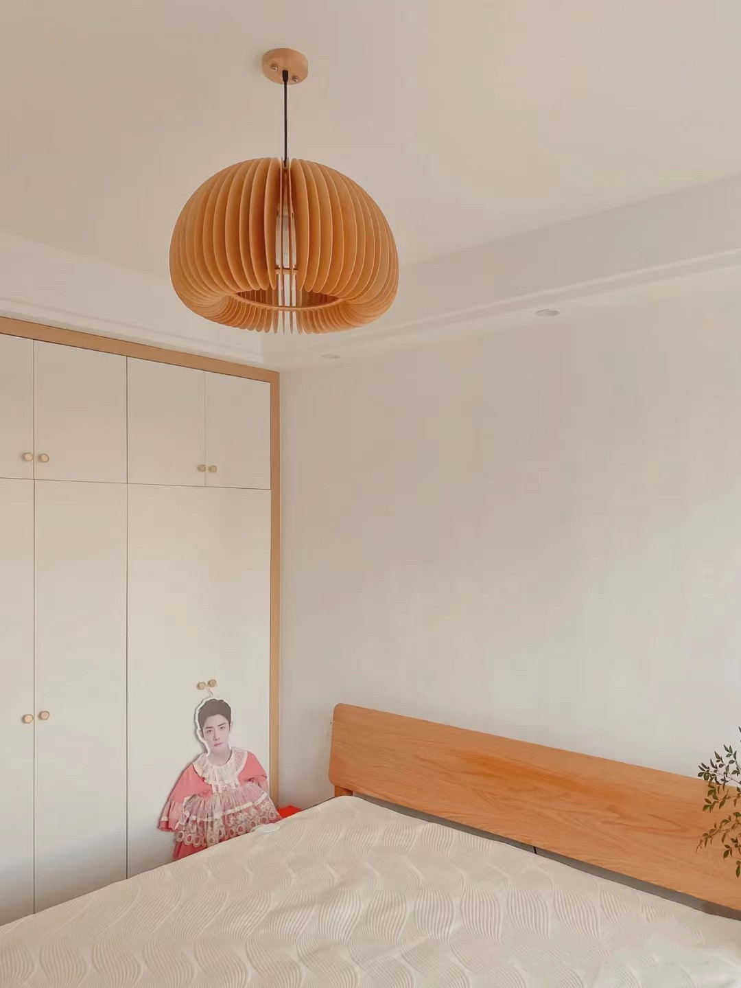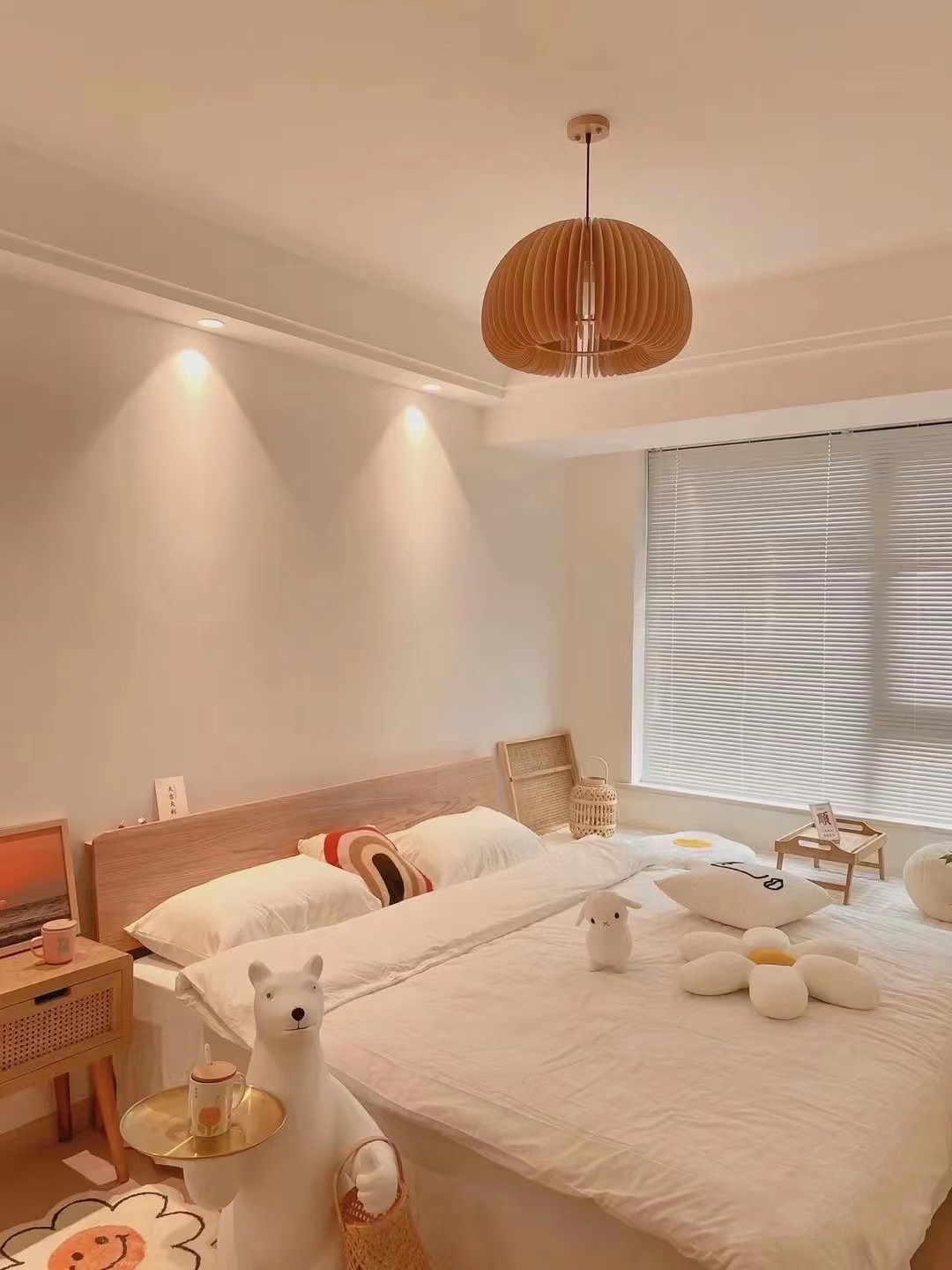 主臥依然以白色和原木色為主,沒有多餘的色彩,自然又溫馨,南瓜折紙吊燈是臥室的點睛之筆,充滿復古又溫暖的感覺,定制的衣櫃也是採用白色和木色拼接,呼應著整體風格,飄窗打造成了休閒區,上面鋪上墊子,放上茶幾和坐墊,便可以坐在這里享受一段美妙的午後時光。