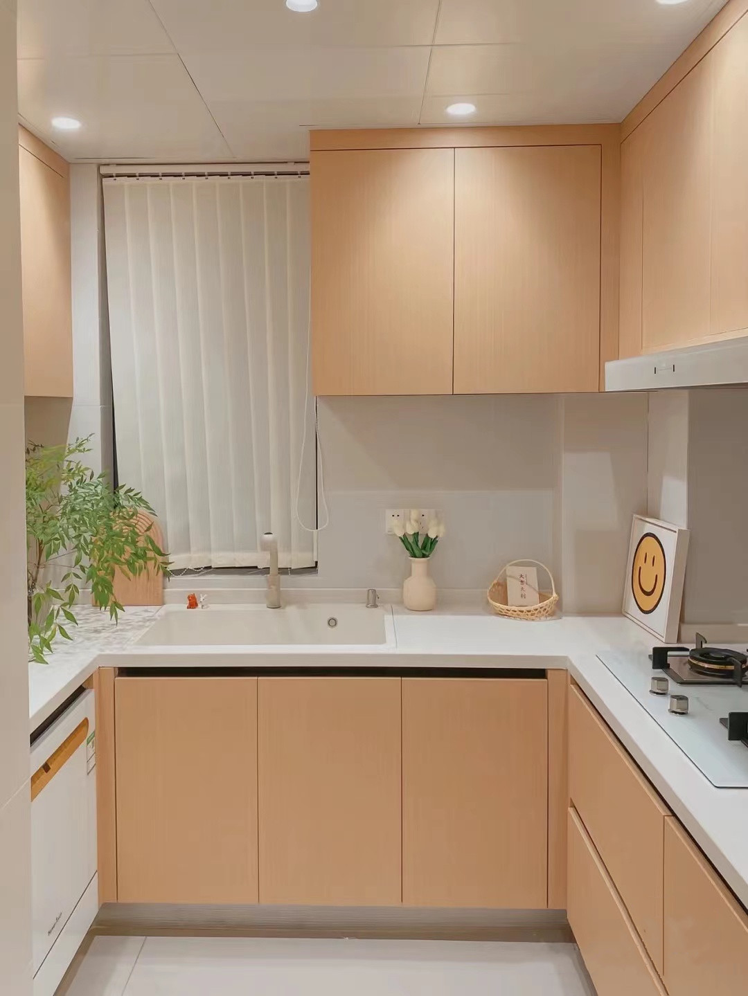 鞋櫃旁邊便是廚房,採用了推拉門隔斷,不占位置,開關靈活又方便,原木色櫥櫃搭配白色台面,把烹飪環境打造得乾淨又自然,灶台上放了一株綠植,既能增生機活力又能淨化空氣,U型櫥櫃布局,儲物充足,操作便捷,將空間利用達到最大化。