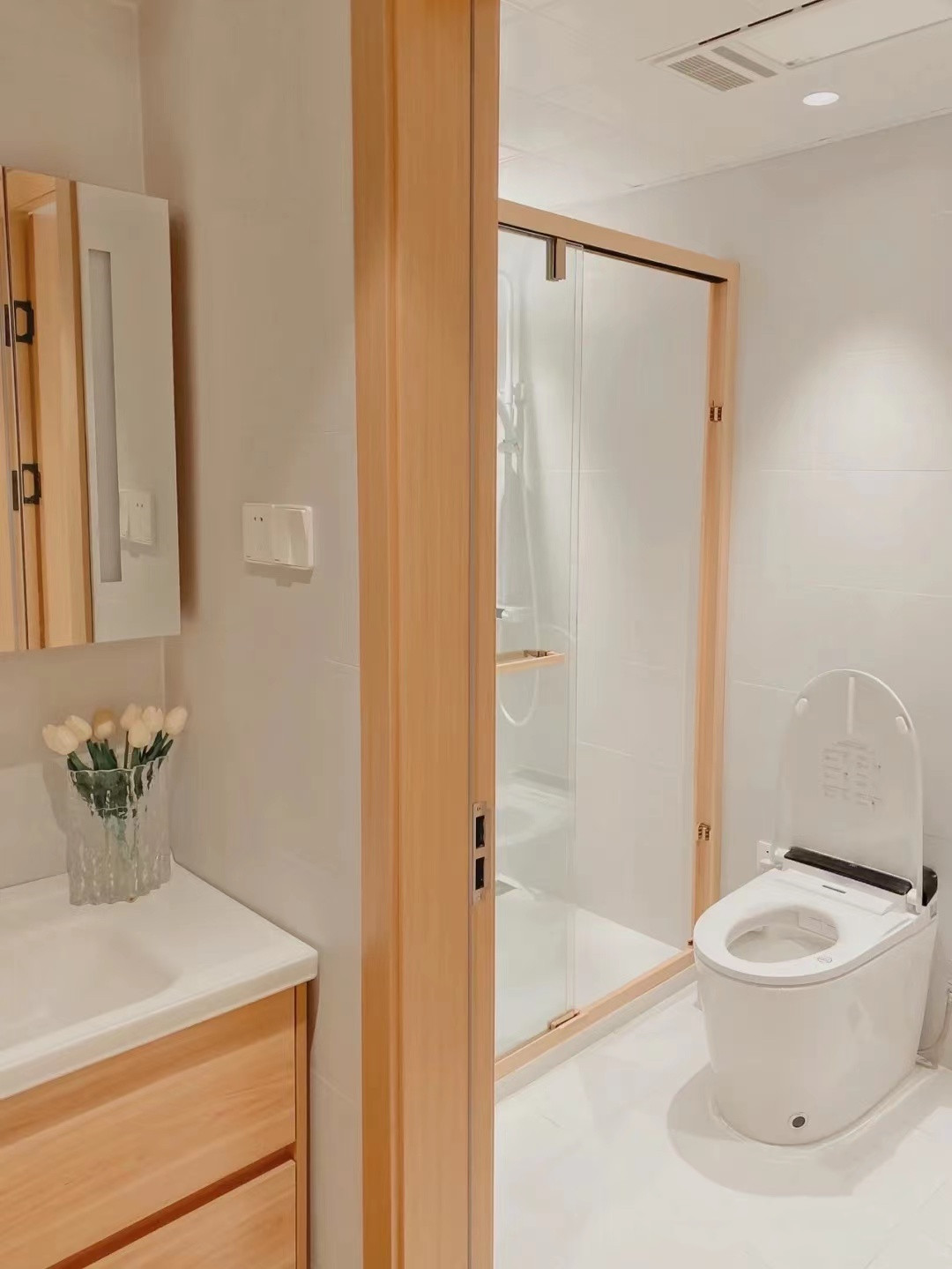 洗漱區設計在廁所門外,洗漱如廁不會相互干擾,可以提高一家人的生活效率,採用鏡式櫃子增加收納,十分省空間,美觀實用,廁所里面用玻璃門隔斷馬桶和浴室,不占地方,有效做到幹濕分離。
