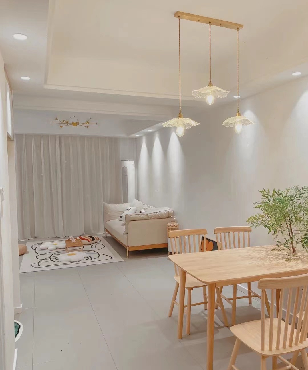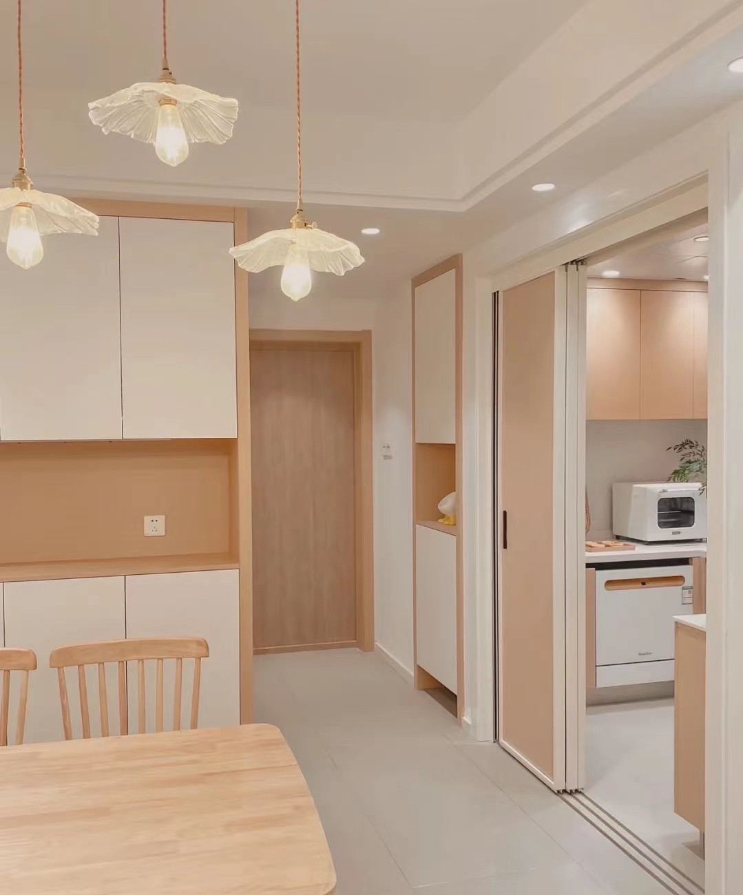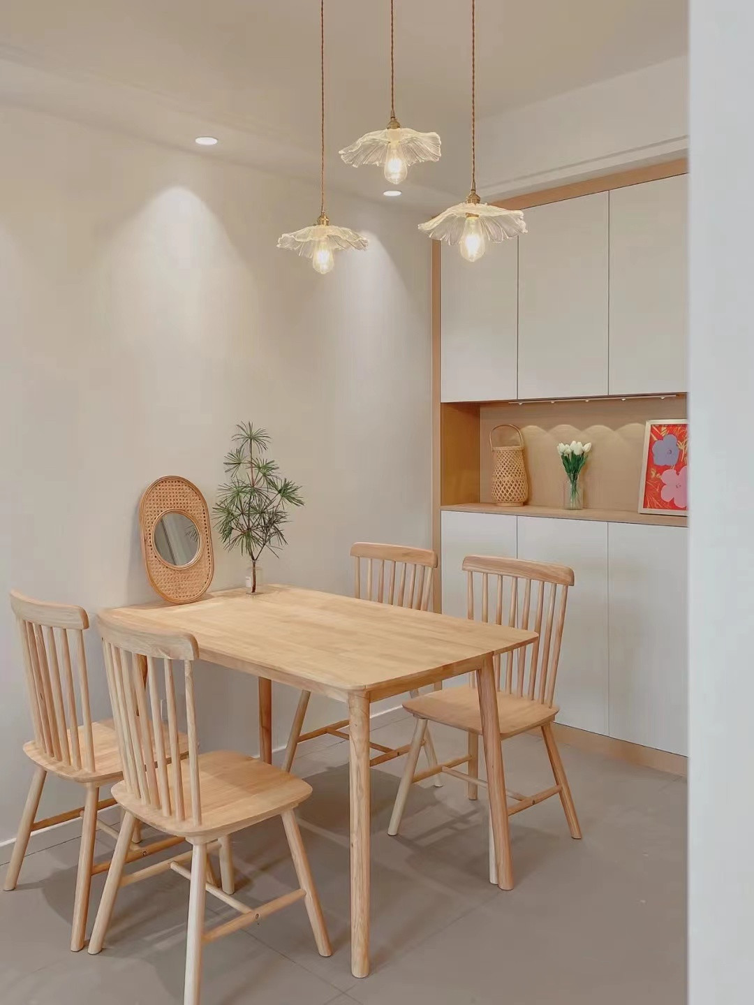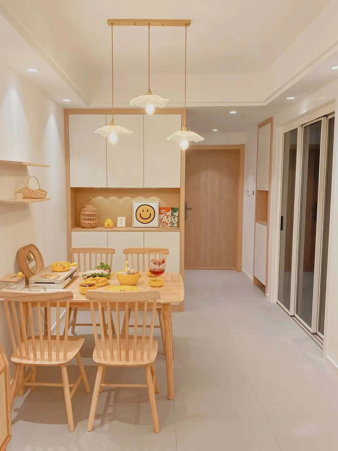 進門往右轉便是餐廳,原木色餐桌椅把用餐氛圍營造得舒適又溫馨,三盞花朵吊燈錯落有致,充滿了層次感,給用餐環境增添了幾分浪漫別致,靠牆定制了一個內嵌式餐邊櫃,非常節省空間,櫃子採用分層設計,展示儲物兩不誤。