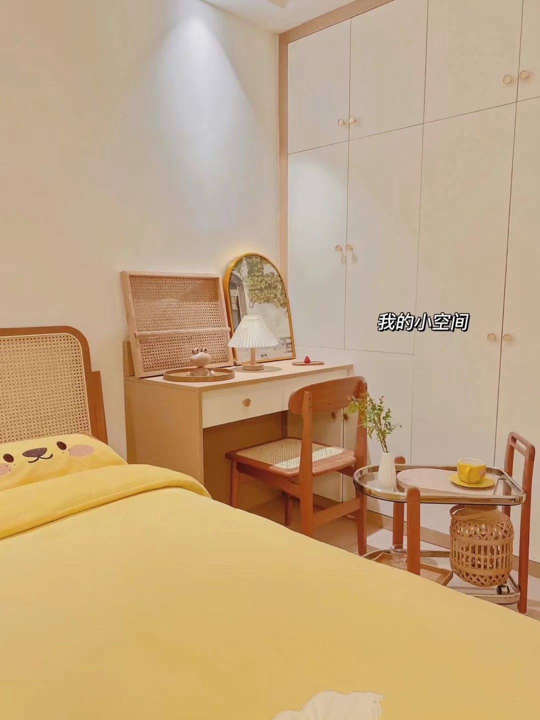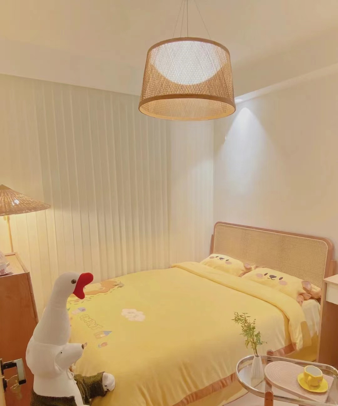 這間是次臥,里面的布置也很簡單,大白牆簡單乾淨,藤編吊燈文藝又復古,散發出的燈光很柔和,把睡眠氛圍營造得無比舒適輕鬆,家具也都是藤編材質,中古又文藝,非常貼和原木風格的特點,給人一種歲月靜好的感覺,床邊安裝了梳妝台,方便屋主人梳妝打扮,衣櫃跟主臥款式一樣,儲物容量很充足。