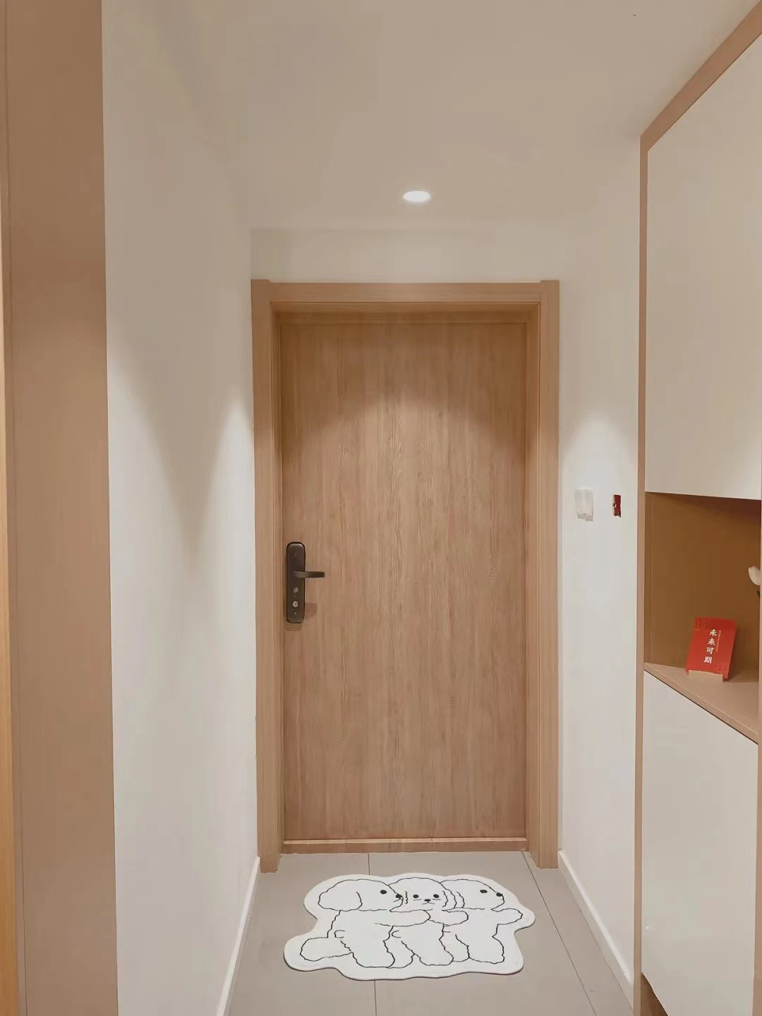 入戶大門也是原木色,跟室內風格很搭,地上鋪了一張狗狗圖案的地墊,靈動有趣,起到了很好的裝飾作用,鞋櫃採用內嵌的方式,與牆面結合在一起,不含空間,整體感很強,中間和底部都留了空位,分別用來展示和擺放常穿的鞋子,美觀實用。