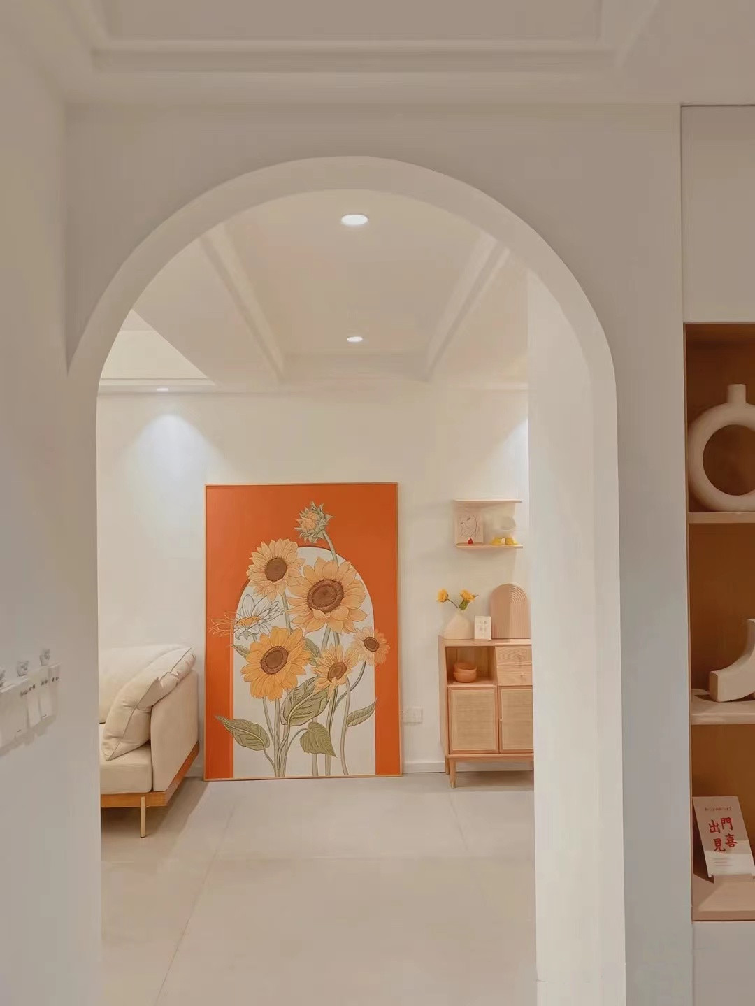 這是通往廁所的過道,設計了一道拱形門洞,復古又獨特,站在里面望向客廳的裝飾畫,恍如一幅美麗的畫卷,同時又充滿了神秘感,可以說是空間的一大亮點,花了10萬的硬裝能有這樣的效果,真的是很不錯。