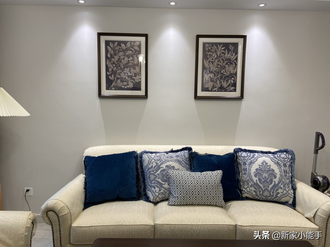 沙發上搭配了很多的抱枕,藍色調,與整個空間剛好搭配。不過,假如沙發牆上掛著三幅裝飾畫,每幅裝飾畫剛好在筒燈光照之下,效果會更完美。家里還沒裝潢的朋友,可以注意一下,這樣的小細節。