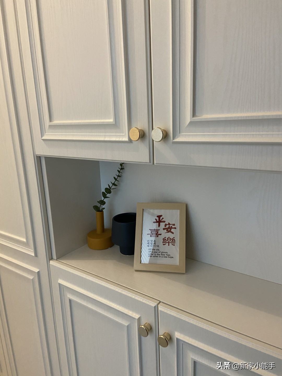 床頭背景牆也是貼了石膏線條,簡單又好看,不會顯得給人壓抑感。床和床上用品都是網購的,睡著很舒服,也搭配的效果顯得很溫馨。頂面沒有選擇安裝吊頂,僅僅走了一圈石膏線條。加上一個衣櫃,基本沒有什麼多餘的空間!