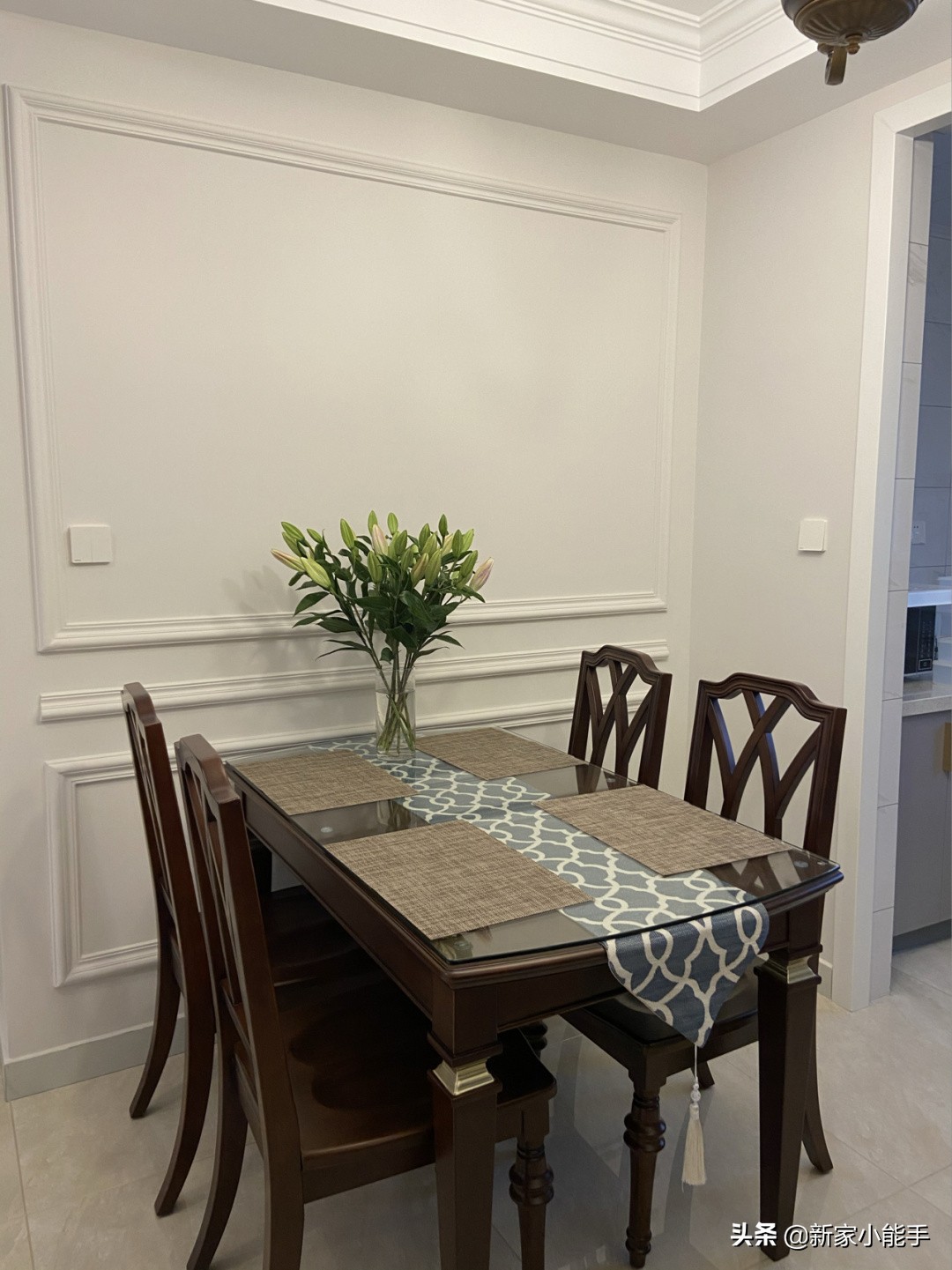 餐廳空間有限,布置了一張實木方形餐桌,占用的空間大小位置合適,餐桌上放著隔熱玻璃,可以起到保護餐桌的作用,這點還是蠻不錯的哈。裝潢美式風格,所挑選的家具都比較符合家里要要裝潢的風格,真心不錯。旁邊就是廚房了,煮好的飯菜可以很快端在餐桌上。