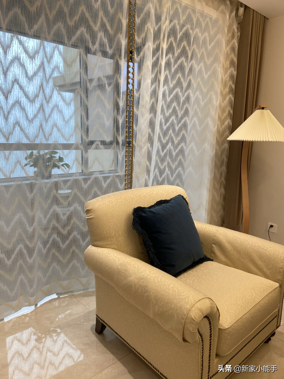 客廳與陽台是打通的,增加了一些室內面積,不過里外都安裝了窗簾,可以起到很好的遮擋,覺得還不錯哈。旁邊布置了網紅款的百褶落地燈,可以起到增加二次照明的作用,讓人看了都喜歡。