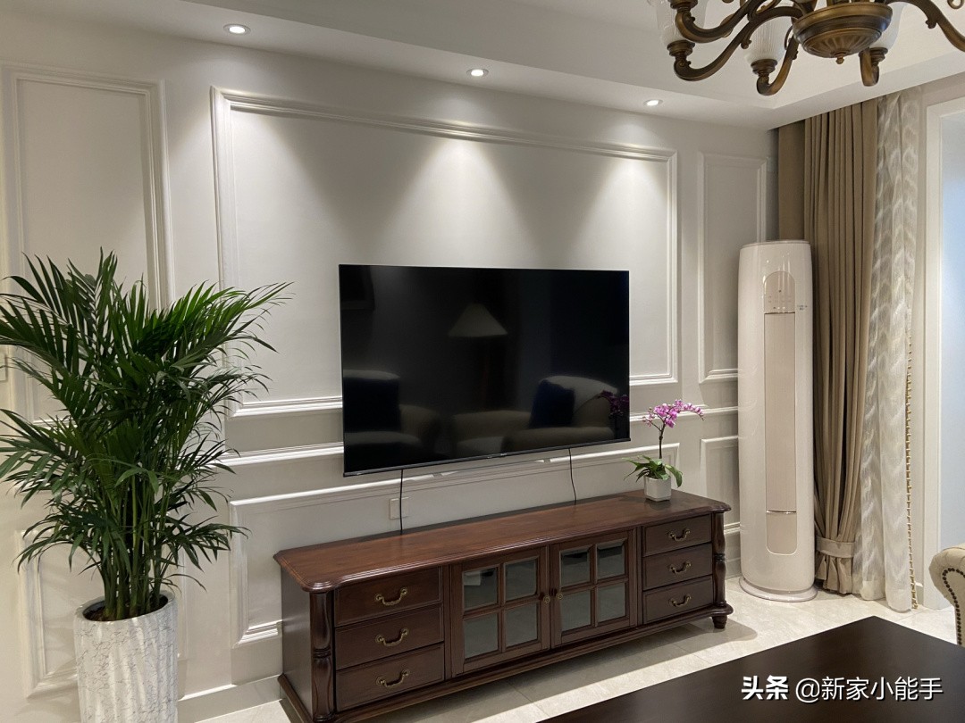 客廳做了電視背景牆,顯得空間不會單調。電視牆也是貼了石膏線條,造型比其他簡單很多,而且造價也比較便宜,視覺感還是蠻不錯的。電視機直接掛牆上,可以為電視櫃節省一些空間,更安全。左側放著植物,右邊放著空調。
