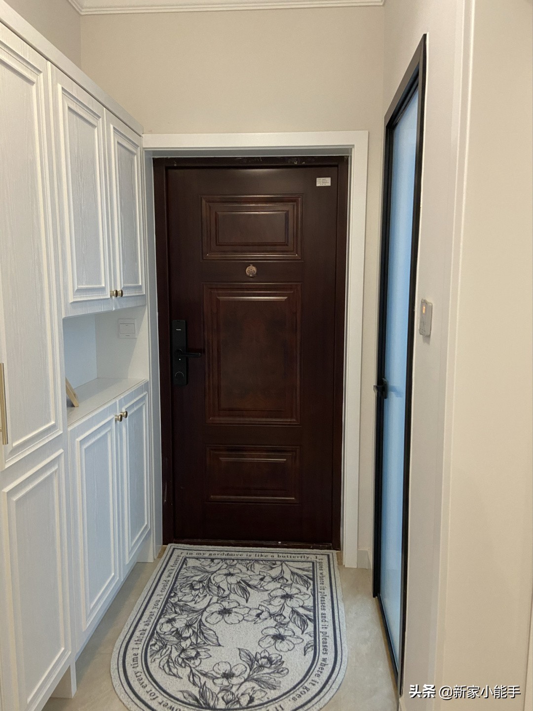 入戶玄關換另外一個角度,鞋櫃分為上下兩層,最底下留空位置,可以放一些常穿的鞋子,保持家里的鞋子可以整齊擺放,不會顯得亂糟糟的一種情況。而大門包著一個白色的門套,顯得比較乾淨,有檔次。包了門套,給人的感覺都是不一樣的。