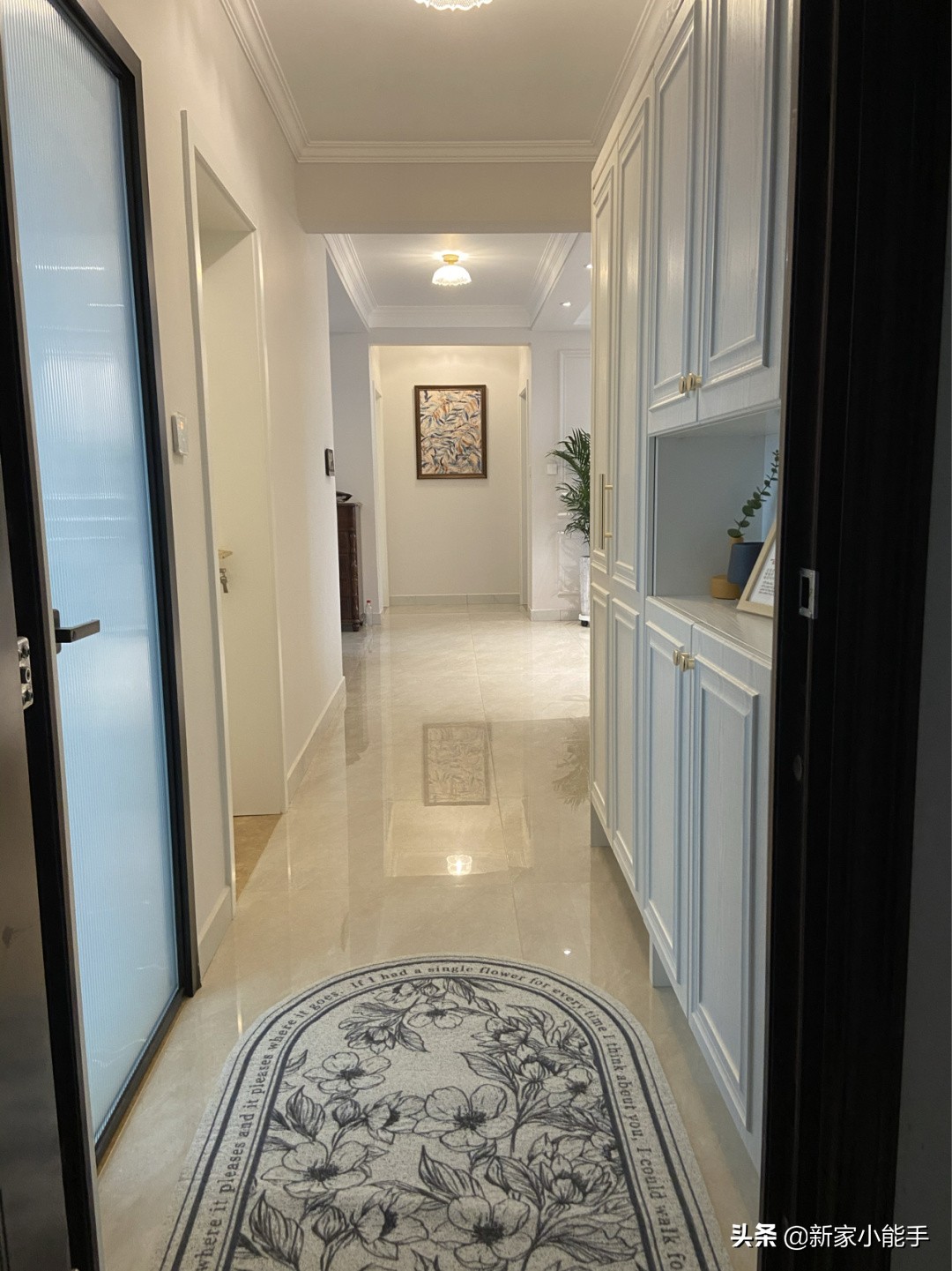 南北通透的戶型,打開入戶大門就是這樣的角度了。右邊設計了一個頂天立地的白色鞋櫃,地面放著花紋的地墊,可以起到很好的裝飾效果,並且可以起到耐臟的作用。對面過道牆上,掛著裝飾畫,看著都很喜歡。