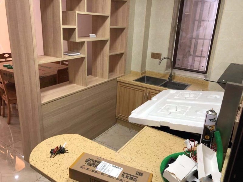 餐廳和廚房連在一起,我們把餐廳和廚房中間的隔斷牆砸掉,然後用櫥櫃牆代替。到時候會安裝一個玻璃門,然後櫥櫃置物架鏤空部分會再安裝一面透亮的玻璃,這樣就不怕油煙飄到客餐廳。