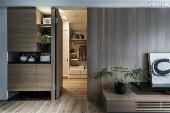 編輯點評:電視牆後方為主臥室,在左側牆面與玄關收納櫃之間設置隱藏式門片,密閉時視覺一體成型、簡潔俐落。進入後首先是開放式衣櫃,方便吊掛使用頻率高的衣物。