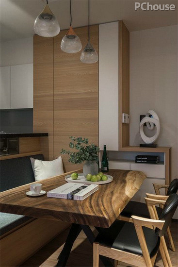 編輯點評:為避免壓迫感,客餐廳在腰部以上的高度都沒有櫃體遮擋視覺,三盞精致的餐燈是入門後的吸睛焦點,依循原木餐桌溫潤的切面引導視覺延伸至窗外。