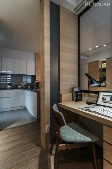 編輯點評:沙發背牆後為書桌台面,一旁的木料門片搭配黑色寬版線條拉長視覺高度,另一側的廚房規劃整潔的白色系,全區遵循原木、黑、白的簡約調性做到自然好感。