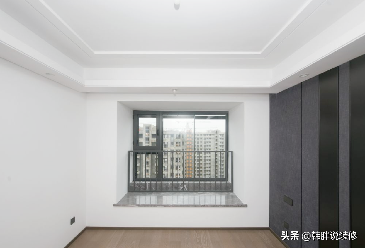剩下的兩個臥室,裝潢設計和次臥一樣的簡潔,都是光禿禿的大白牆。天花板都是設計了假梁吊頂,搭配上嵌入式的筒燈,倒是給簡約的效果增添一些點綴。